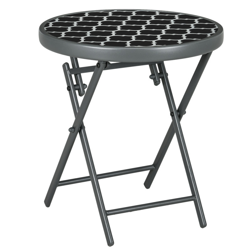 An essential for outdoor spaces. Pair this patio side table with your chair: create a spot where you can sit, drink and enjoy the fresh air. A powder coated steel frame for a strong structure; it can be folded so it can be carried around and stored easily. Fitted with a round tabletop, the tempered glass is thick and ensures a safe dining/holding surface. A must for this season and beyond.