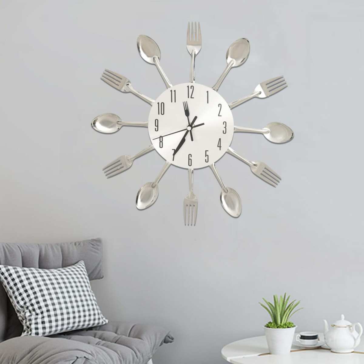 wall clock with spoon and fork design, silver, 31 cm, aluminum