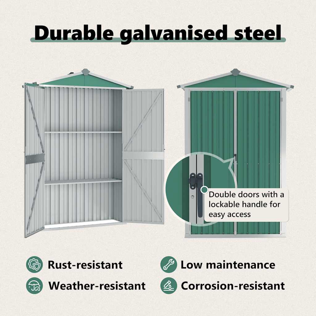 Description: This garden shed is ideal for storing a variety of items such as tools, garden furniture, gardening equipment, and more. It offers protection from dirt, dust, strong winds, and harsh weather. This storage shed is equipped with ventilation slots that ensure optimal airflow, reducing the build-up of moisture and odors. Thanks to the shelves, it provides ample storage space for your essentials. The double doors at the front allow for easy entry and exit. The sloping roof ensures rainwater runs off automatically. Good to know: To prevent damage from heavy snow, we recommend regularly clearing the roof during the winter. Equipped with shelves, the shed offers plenty of storage space to neatly keep various essential items organized. Furthermore, this galvanized steel garden shed requires minimal maintenance and is very durable. The sloping roof allows rainwater to run off easily. Properties: