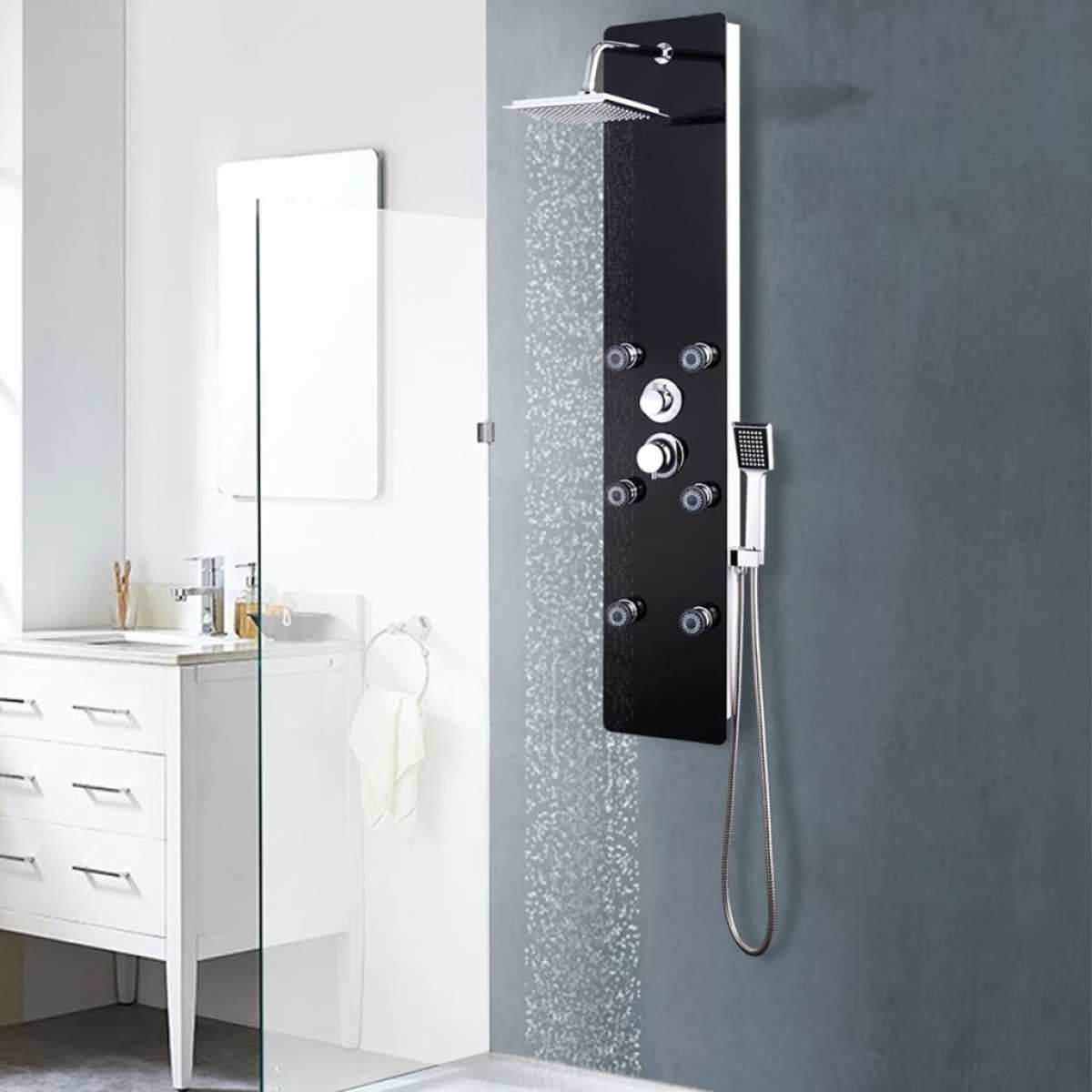 Description: This multifunctional shower panel system boasts a stylish and natural design, beautifully complementing and enhancing the aesthetics of your bathroom. The shower tower is crafted from stainless steel and tempered glass. Tempered glass is produced through a controlled thermal or chemical treatment, making it more durable and safer than standard glass. The silicone nozzles are resistant to limescale buildup. Installation is straightforward, and all necessary mounting hardware is included. Properties: