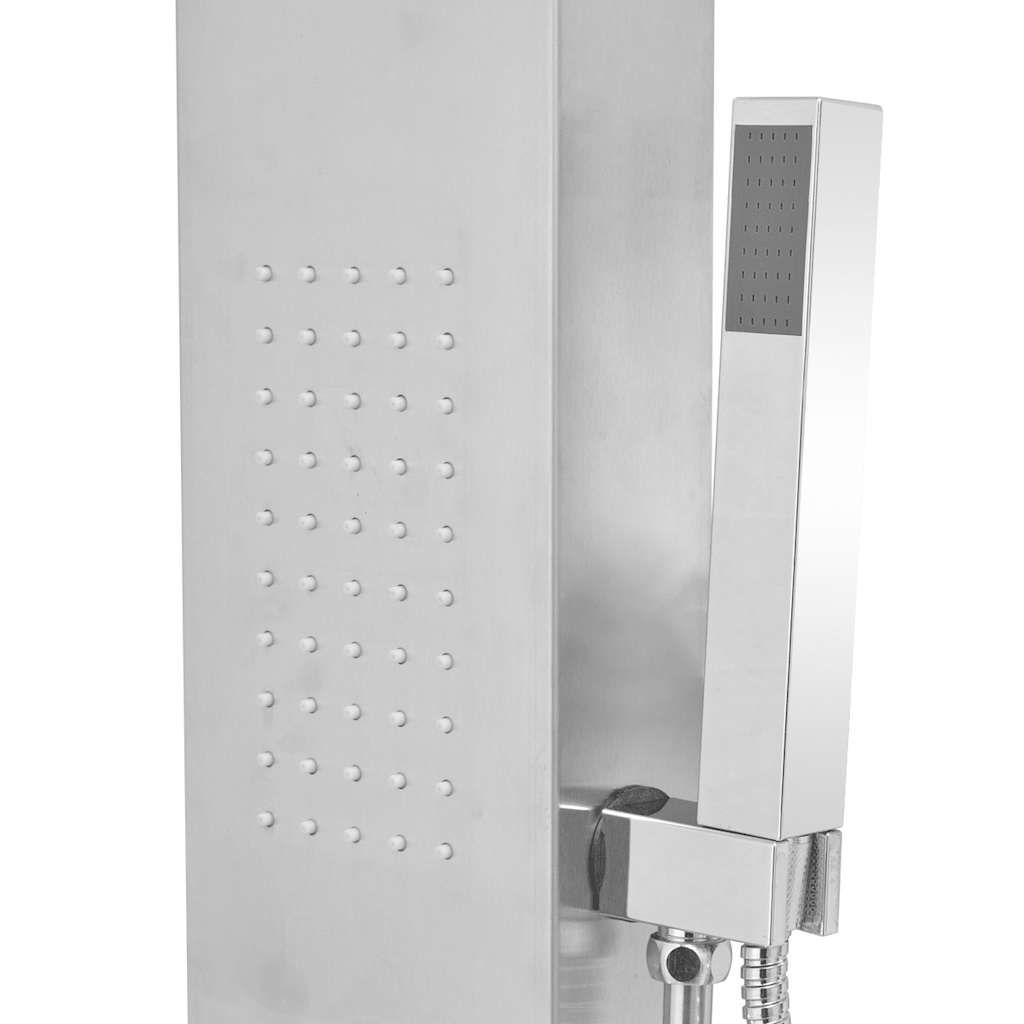 Description: This multifunctional shower panel system boasts a stylish and natural design, beautifully complementing and enhancing the aesthetics of your bathroom. Made of durable stainless steel with a brushed finish, this shower enclosure features a stunning rectangular design. It offers four modes: a rain shower, a cascade shower (waterfall), massage jets, and a handheld shower head, all easily selectable with a single control. Properties: