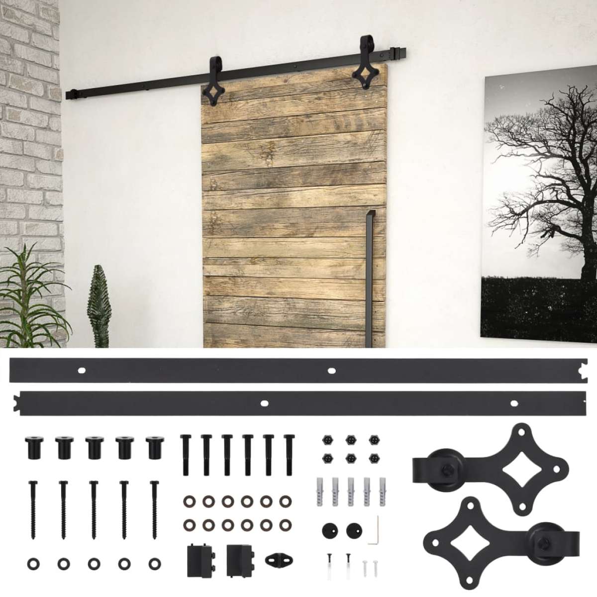 Description: This sliding door hardware set allows you to open and close the sliding doors of your barn, kitchen, study, etc., quietly and effortlessly. With its compact, timeless design, the set complements almost any décor. This sliding door hanging kit includes two guide rails (with a total length of 183 cm) and two wear-resistant rollers. The powder-coated steel guide rails are extremely robust, durable, and hard-wearing. Thanks to the internal bearings, your doors glide quietly and smoothly. The hardware set also includes a floor guide to stabilize the door movement. Note: The door is not included. Properties:
