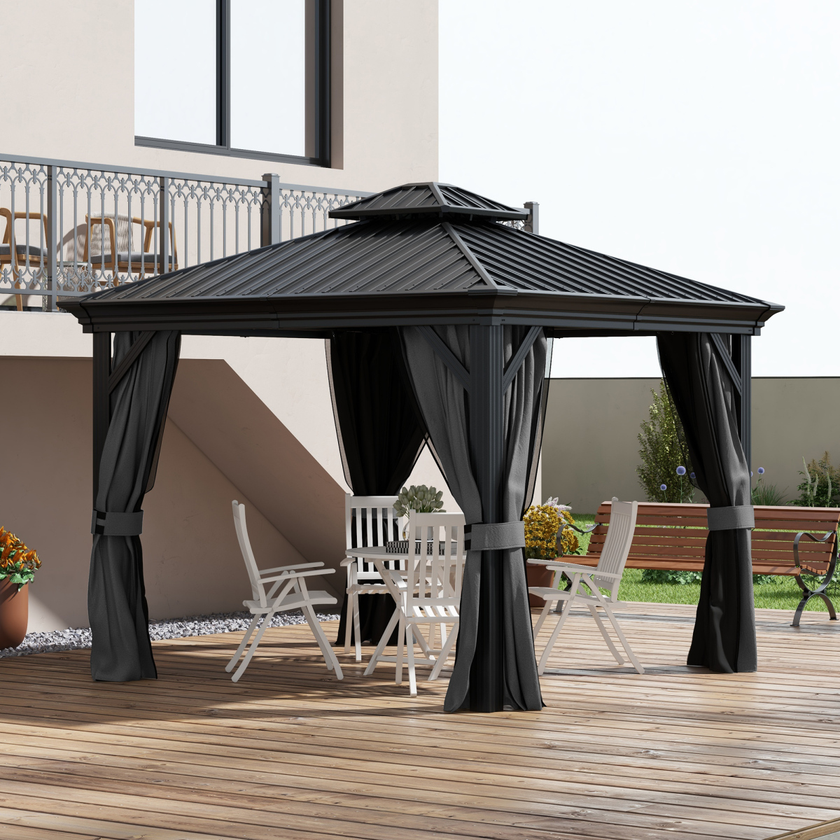 Additions, renovation, and thoughtful design can instantly raise any home's value. Installing a metal hardtop gazebo is an excellent way to renovate your property, providing form and function. Create a unique, versatile space where guests can gather for parties, picnics, and events. [BRAND NAME]'s metal gazebo offers sun, wind, and rain protection. Sidewalls keep out unwanted winged things and eliminate glare. When it comes to canopies, gazebos, and pergolas, a hardtop outdoes all.