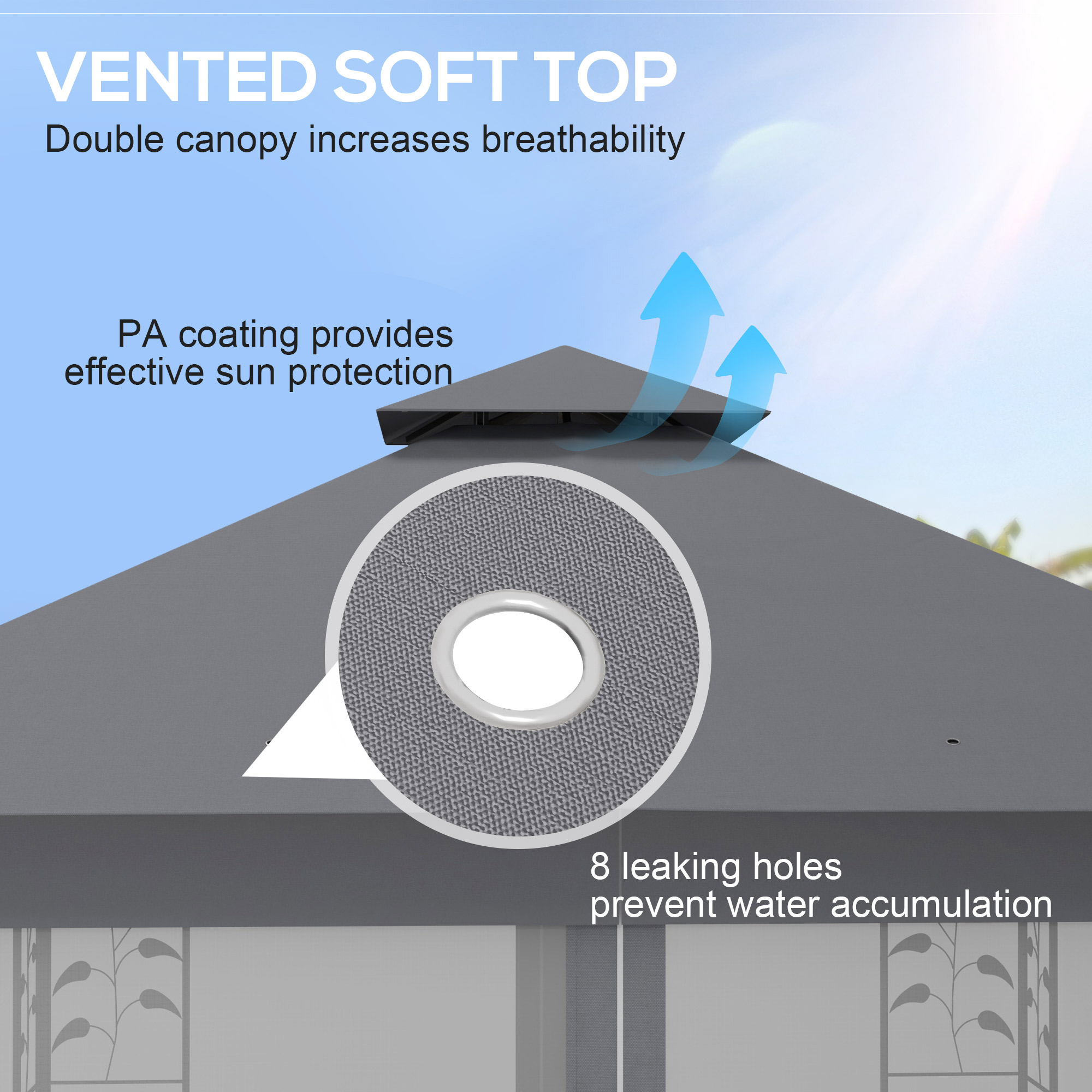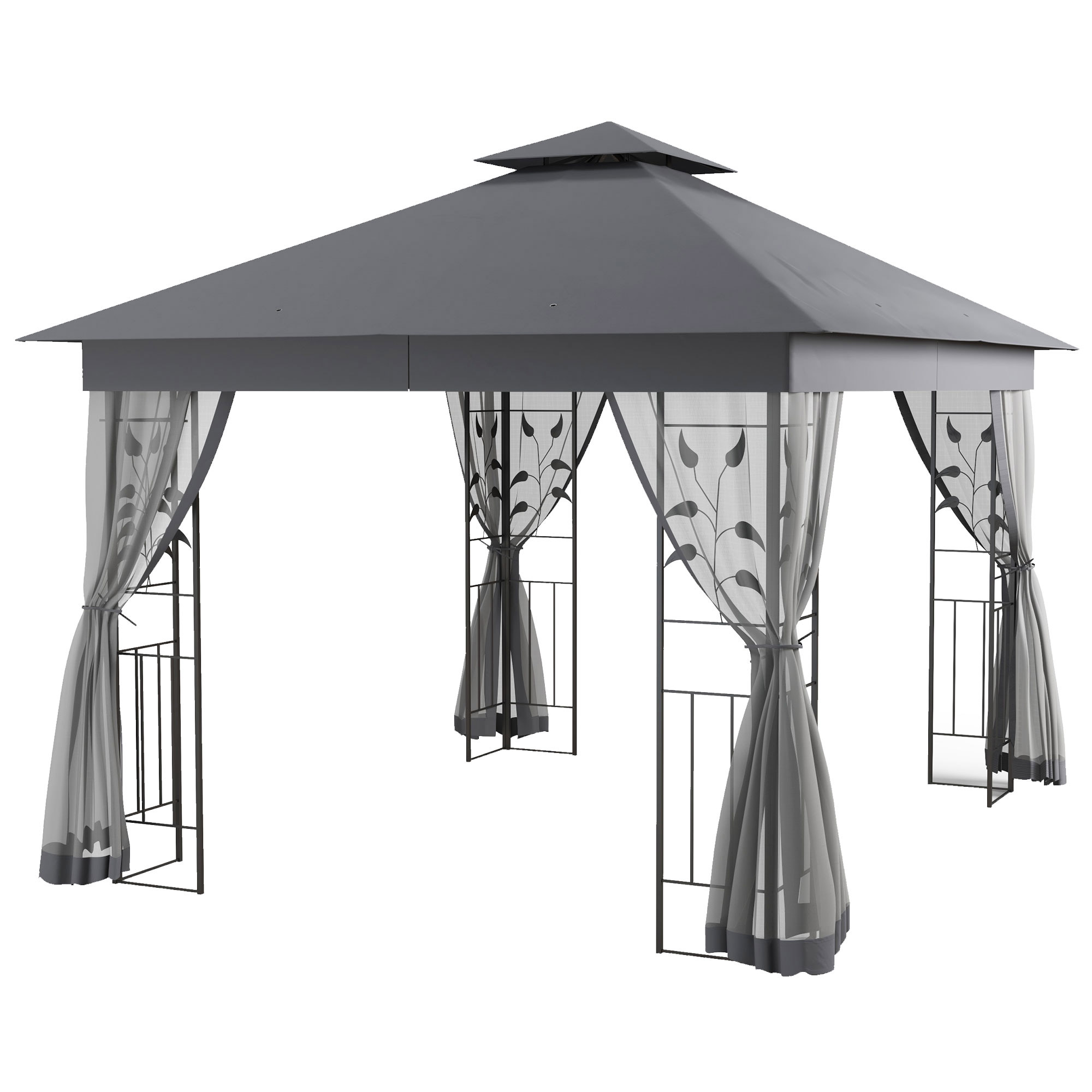 Our 10x11.5 gazebos for patios have reinforced corners with a garden-gate-like look, and tree motifs, making it an excellent accent piece for a wedding or other event. It has a two-tier canopy that not only adds to its appearance but also helps it redirect wind flow for a more stable design. The sidewalls allow in the breeze, filtering out those unwanted winged fiends. Get out, get comfy, get [BRAND NAME] backyard gazebo.
