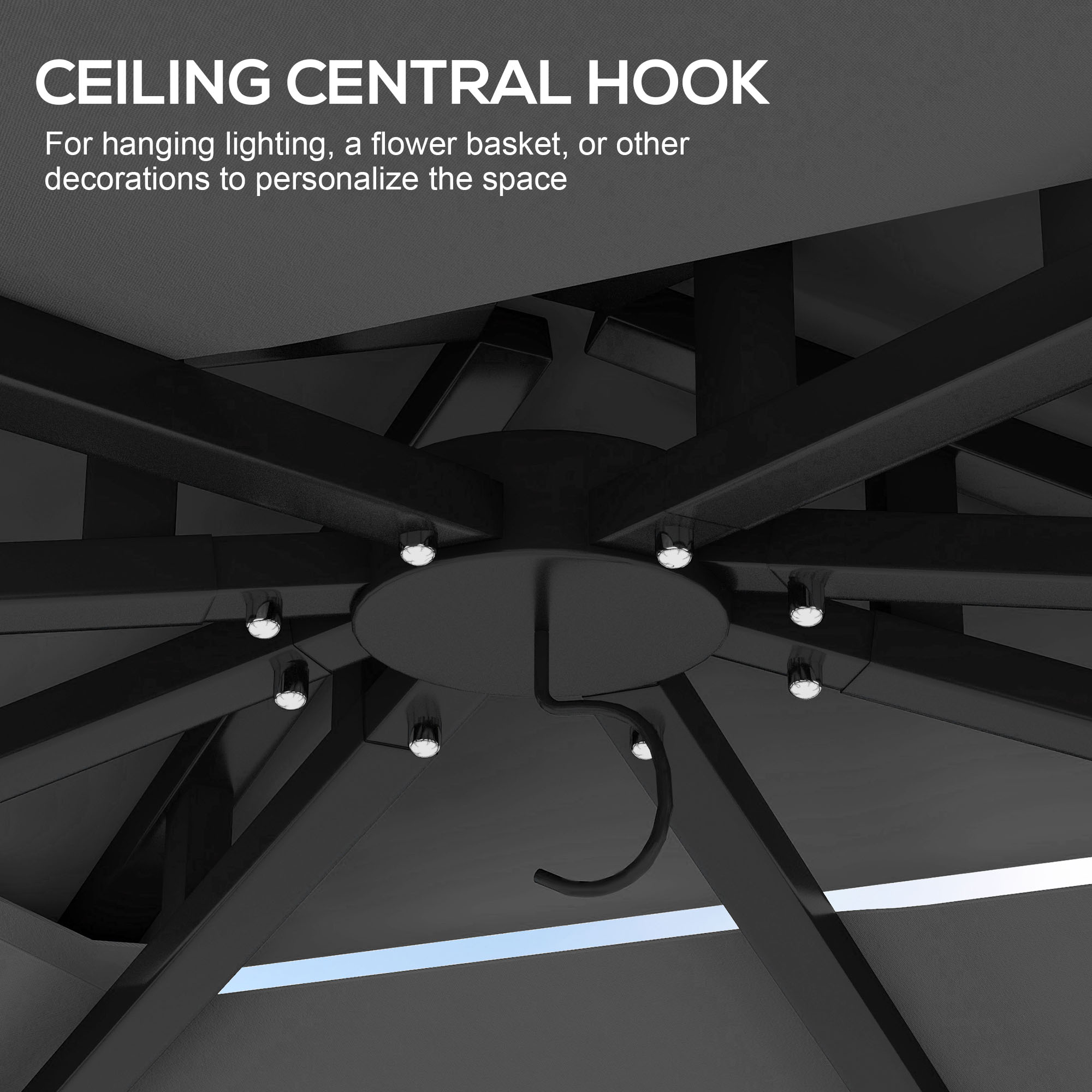 [BRAND NAME] offers you the option to fit a crowd without feeling crowded. This large outdoor canopy gazebo provides you shading without fading. Get rid of unwanted winged guests by putting up the included mesh curtains. With a two-tier roof, you can enjoy cozy air flow without making your sitting space muggy. Featuring stakes and screws for mounting your screened gazebo on soft or hard ground, your plans are firmly planted. Get out and get comfy with an [BRAND NAME] screened gazebo.