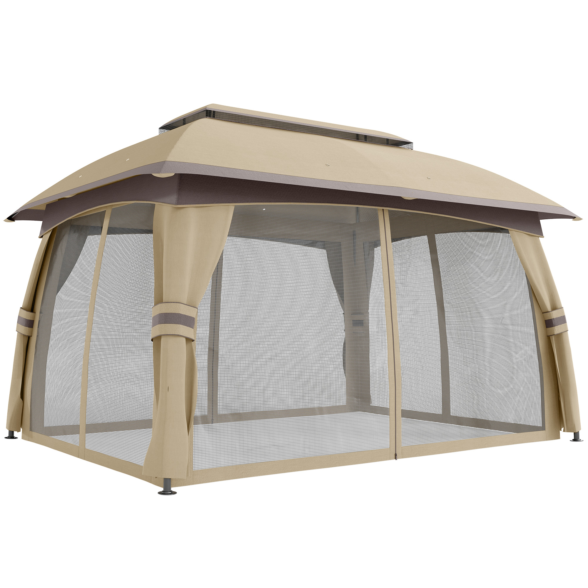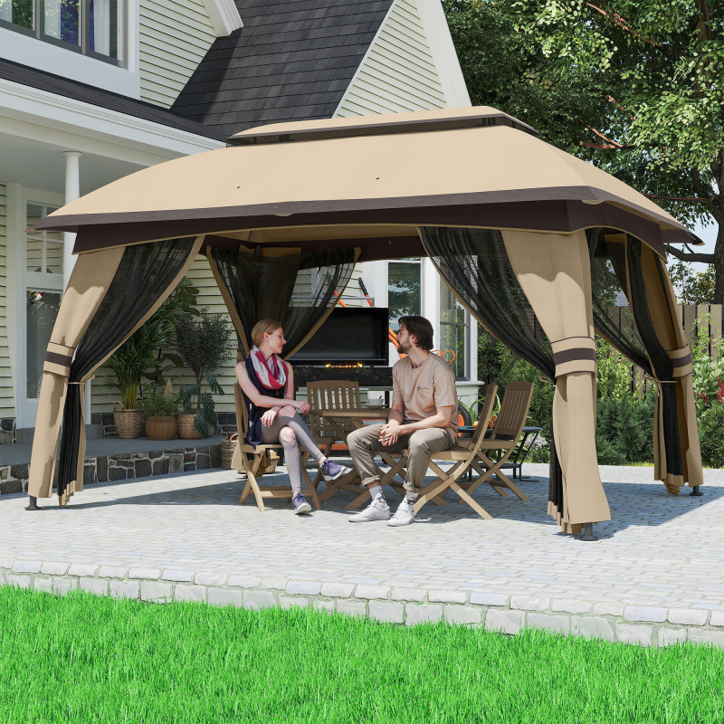 Want to fit a crowd without feeling crowded? [BRAND NAME] offers you the option. This large gazebo is a canopy that can provide you shading without fading. The outdoors doesn't have to bite. Get rid of unwanted winged guests by putting up the included mesh netting. With a vented polyester tent top that's netted, too, you can provide protection from all angles. Featuring stakes and expansion screws for mounting to soft or hard ground, your plans are firmly planted. Get out, get comfy, get [BRAND NAME].