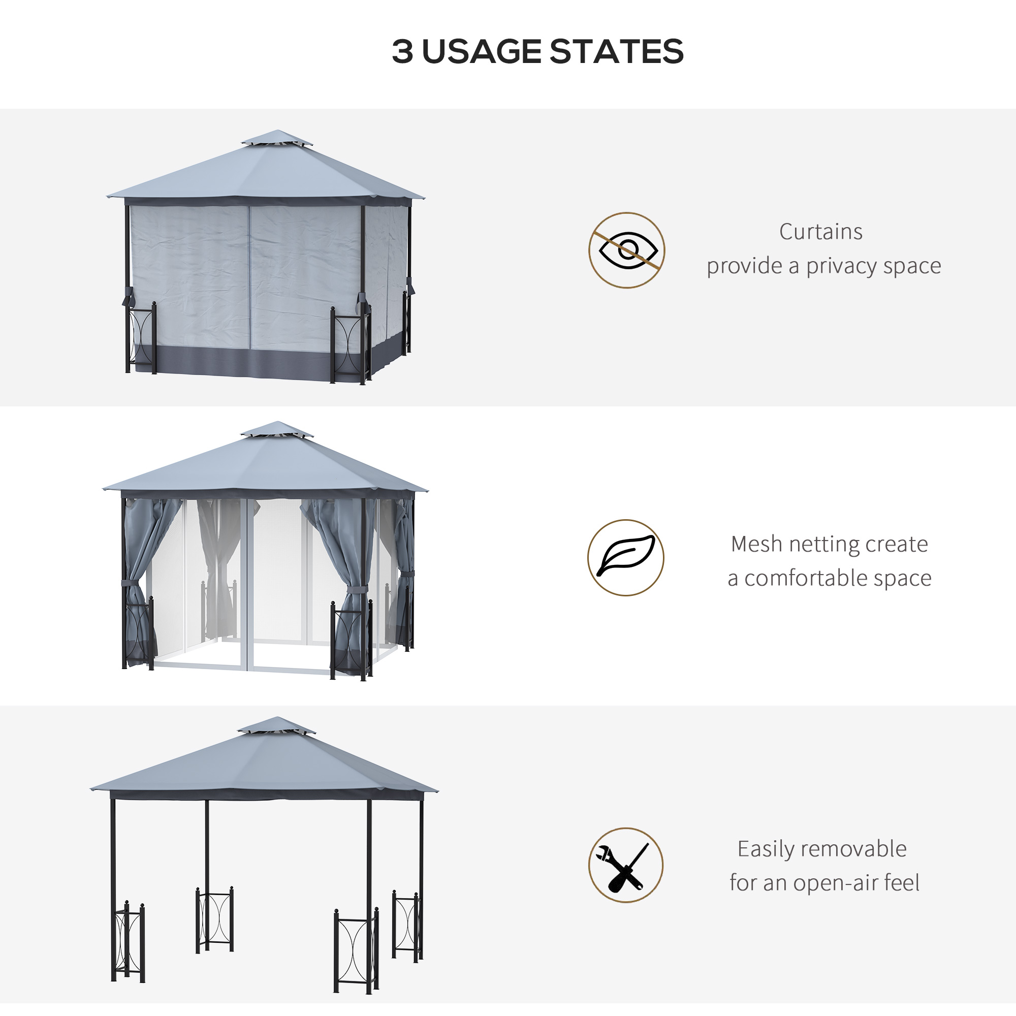 This 13' x 11' spacious gazebo tent with sidewalls from [BRAND NAME] is a great way to upgrade your outdoor space with elegance. You can entertain your friends and family members to hold the party or just relax and enjoy the conversation in the patio cover for shade and rain. The outdoor canopy features a solid steel frame with a polyester canopy and 2 layer sidewalls for strength and full shade. You deserve some comfort in the sun shade: create your own personal oasis with our garden gazebo.
