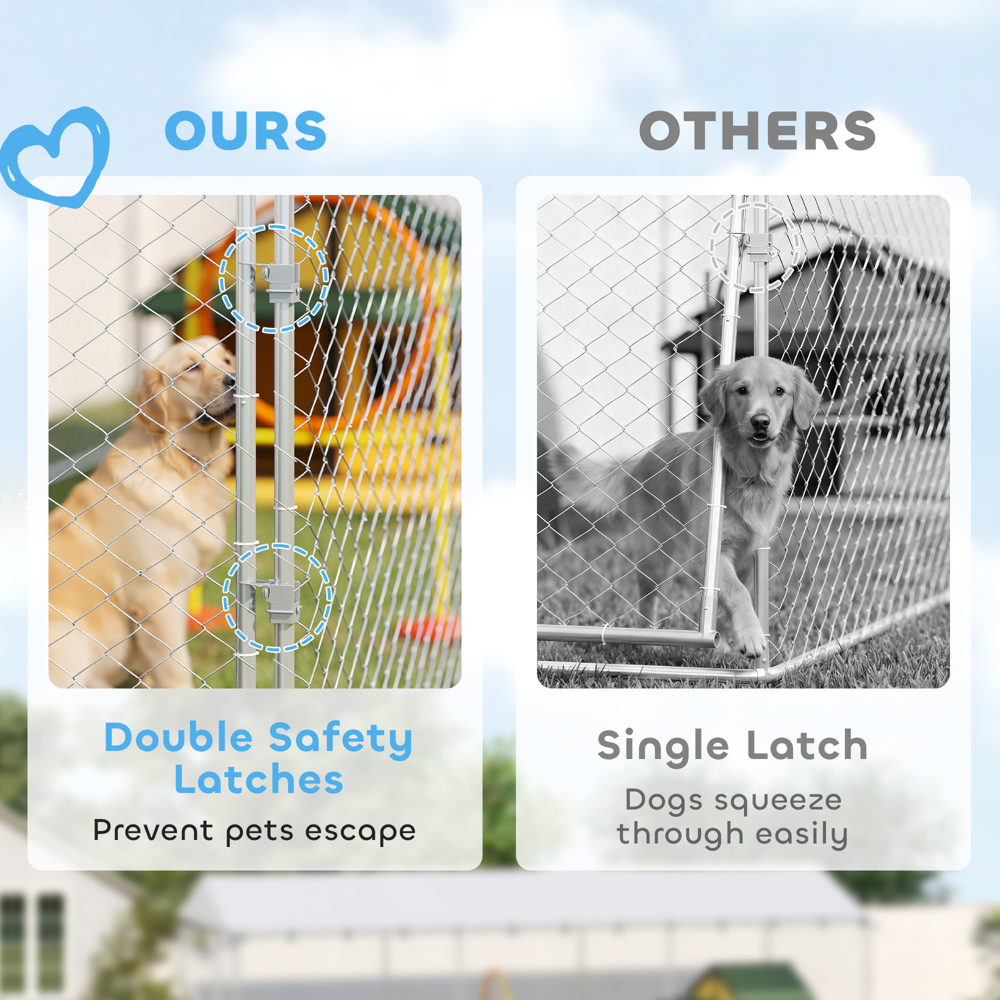 This [BRAND NAME] outdoor kennel caters to pets that need to burn off energy, feel comfortable, and have plenty of space. Keep small to large-sized dogs cool, dry, and covered in the roofed living area that offers shade and rainproof protection. Prevent excited pups from jumping over the edges with its tall wall height and roof. This heavy-duty outdoor dog cage features strong steel railings, providing the durability to withstand harsh use.