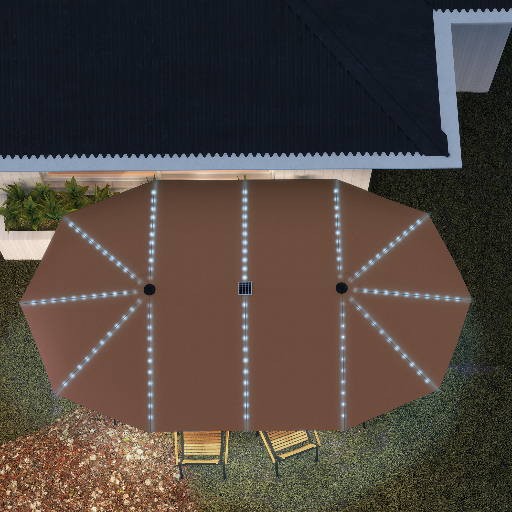 Transform your patio into a nighttime oasis with the [BRAND NAME] Double Umbrella! Featuring built-in lights for a cozy atmosphere and a 200 gsm polyester fabric with UPF50+ to protect against UV rays. The thick aluminum pole and 12 glass fiber ribs ensure rust-proof support. Whether you're hosting a dinner party or unwinding with loved ones, the extra wide shade coverage and soft illumination will provide a pleasing performance