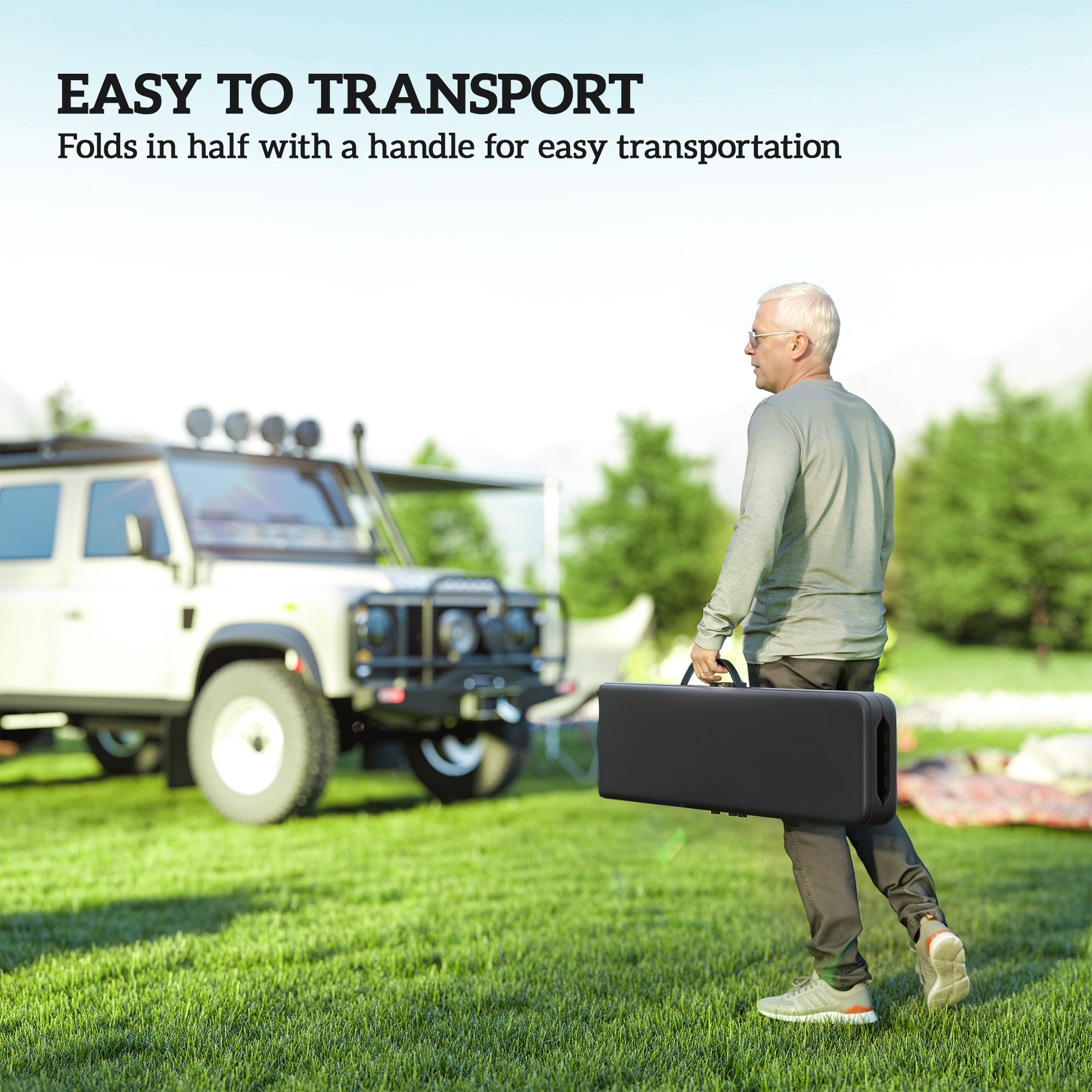 • - Folds in half with a handle for easy transport and storage