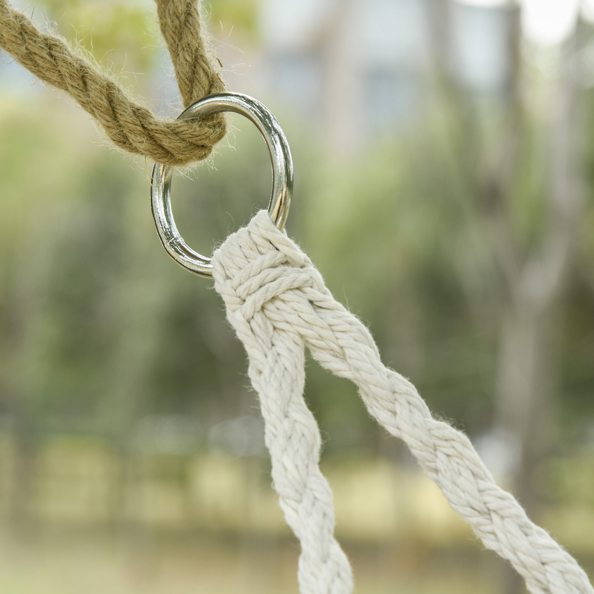 Enhance your indoor and outdoor spaces with elegance using this rope hammock hanging chair from [BRAND NAME]. With boho-style design and spacious two-seat layout, the hammock swing chair features netting cotton rope for the seat and back, along with fringe tassels for a unique and attractive look. Solid metal frame ensures durability, while the slightly curved front seat and built-in armrest provide added comfort and support. Relax outside on this comfortable porch swing chair.