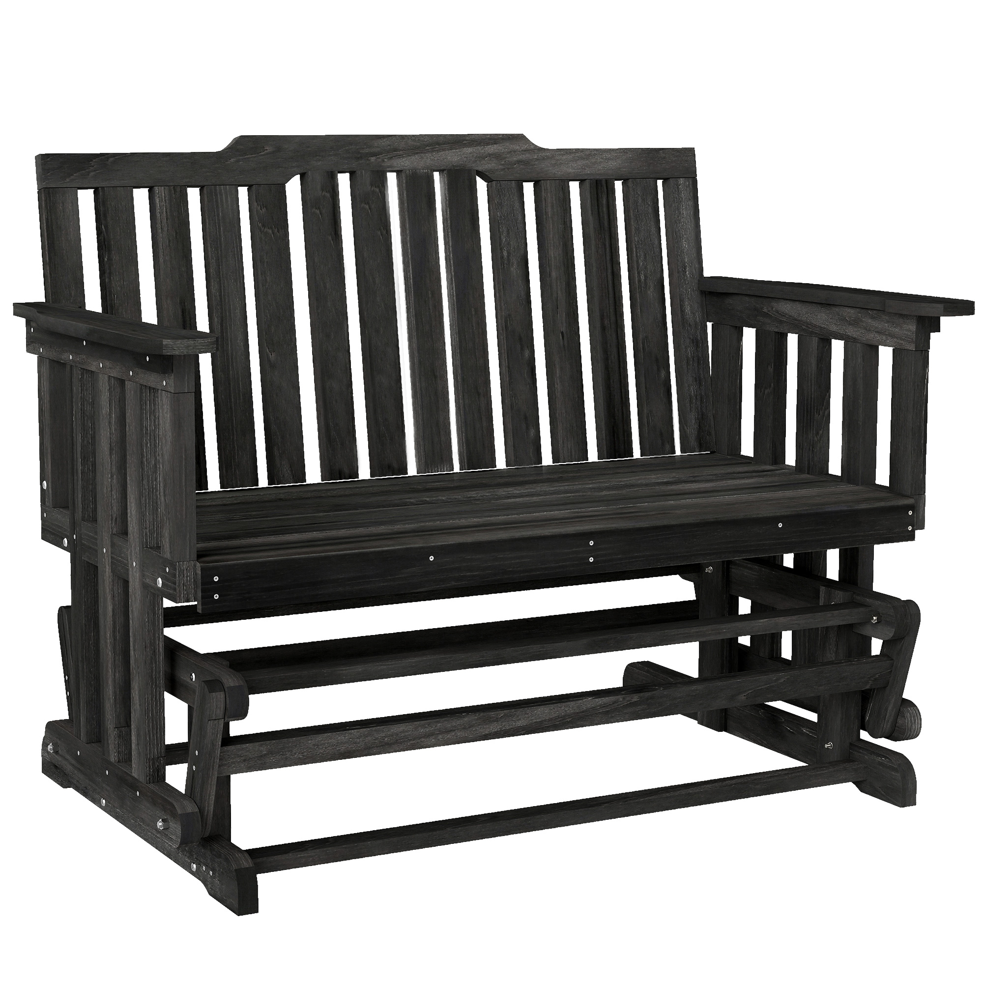 Make the most of your outdoor space when you bring home furniture that's cozy to sit on and look at. [BRAND NAME] has a glider bench for outside that's a sure centerpiece. Swing back and forth, soaking in the atmosphere. This bench has a calming quiet glide. Rustic wooden slats offer an outdoor-ready, sturdy build that's easy to wipe, breathable, and easy on the eyes. Nothing is a better pair for a porch than a wooden rocker, and with a bench build, this glider lets you sit with a friend too.