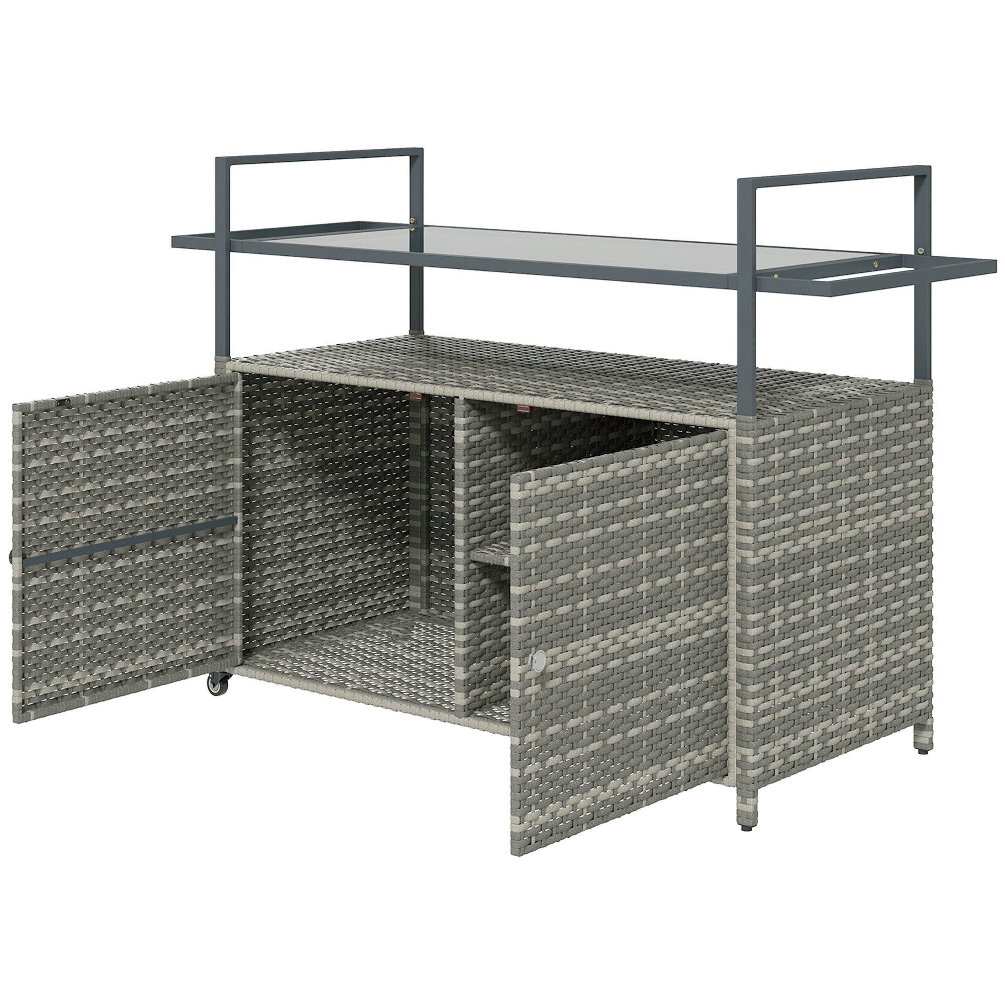Take your entertaining to the next level with an outdoor bar cart by [BRAND NAME]. It has a tempered glass table, second layer and a cabinet on the bottom, giving you room to cart in entrées, drinks, and ordures. Lift the handle and roll it around; it's easy to go from the kitchen to your outdoor dining space, and the included brakes lock it in place. Use a handle as a towel rack and keep cleaning supplies in the cabinet. It endures spills and outdoor conditions. Get on a roll with [BRAND NAME].
