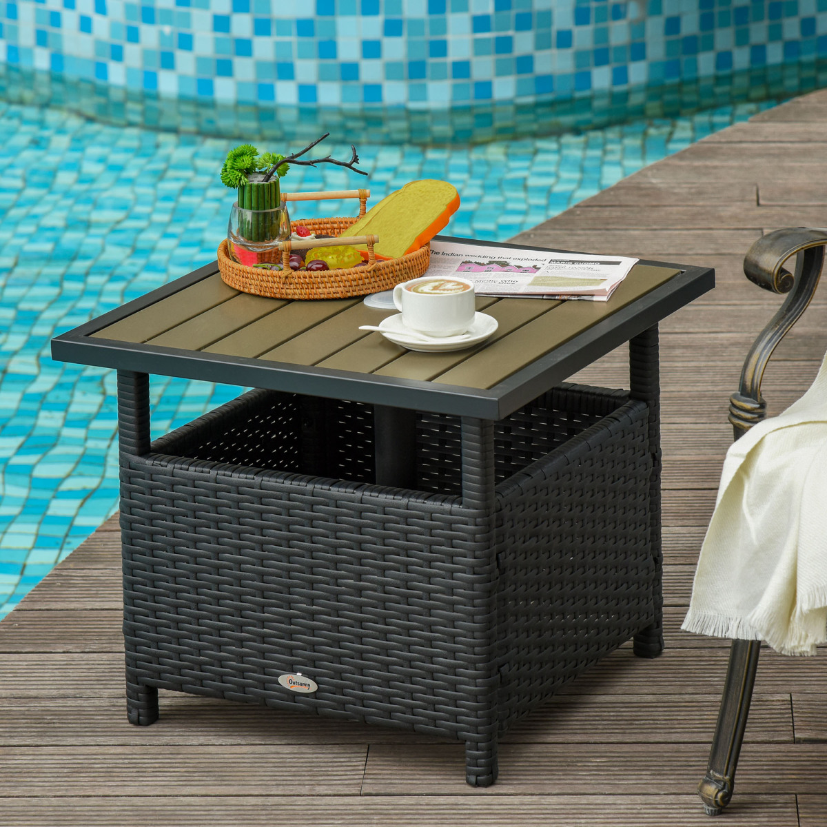 The [BRAND NAME] Rattan Wicker Outdoor Accent Table with Umbrella Insert features an elegant design and functional umbrella insert. The wood-styled polyethylene top is waterproof, stain-resistant, and easy to clean. The weave rattan basket underneath can be used for storage or filled with weights when supporting a patio umbrella through the 1.2" diameter umbrella insert. Furthermore, you can accommodate a 1.75" diameter umbrella when removing the insert, allowing for greater flexibility.