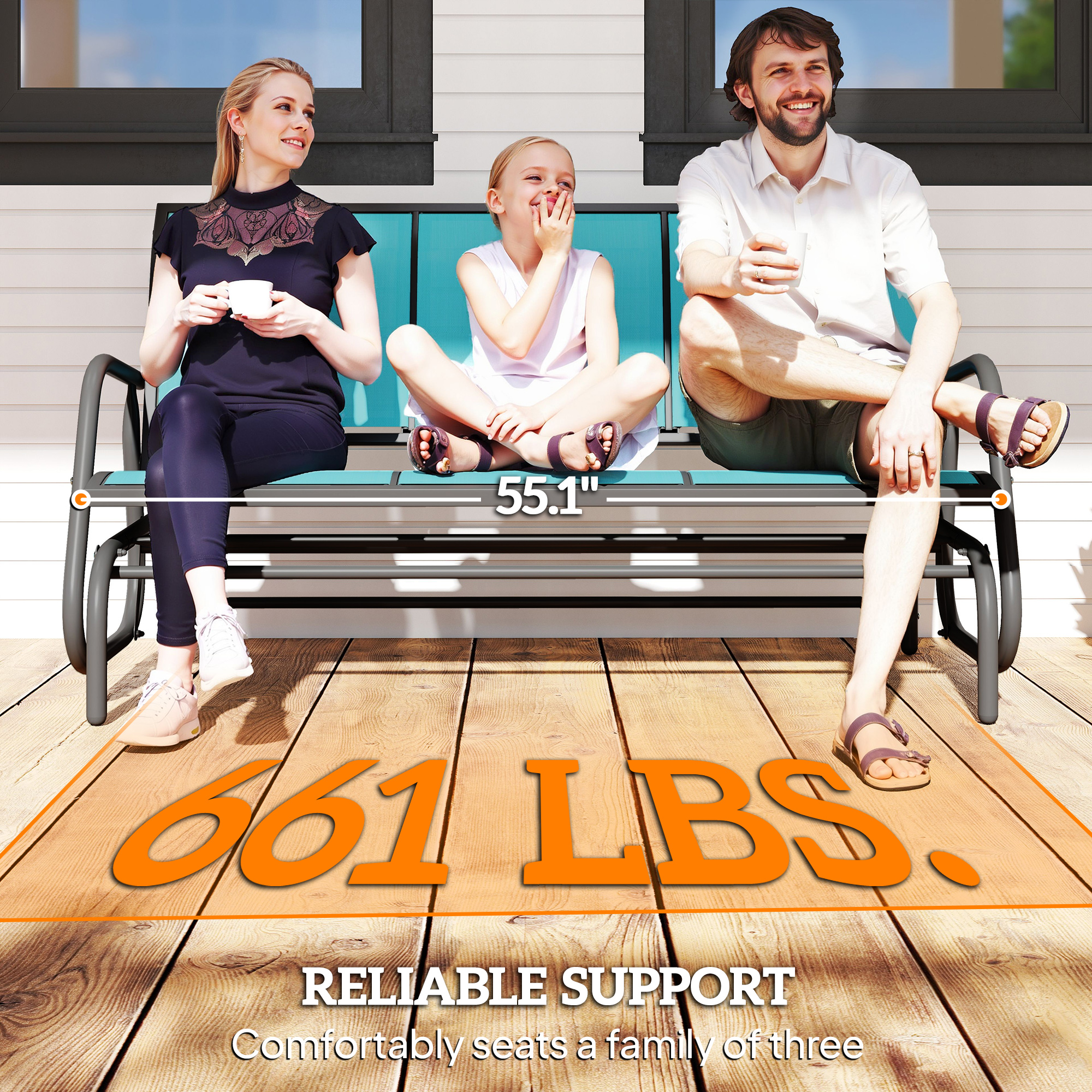 Glide through the summer with two friends and [BRAND NAME]. This porch glider offers form and function for any space outside: backyard, balcony, porch, pool, or garden; get gliding and sit in style. Its surface is extra wide and capable of seating three people at once. Said seat is crafted from breathable mesh that stays cool in the summer sun and dries off fast. Sit back and take in the summer breeze without worry. Get out, get comfortable, get [BRAND NAME].