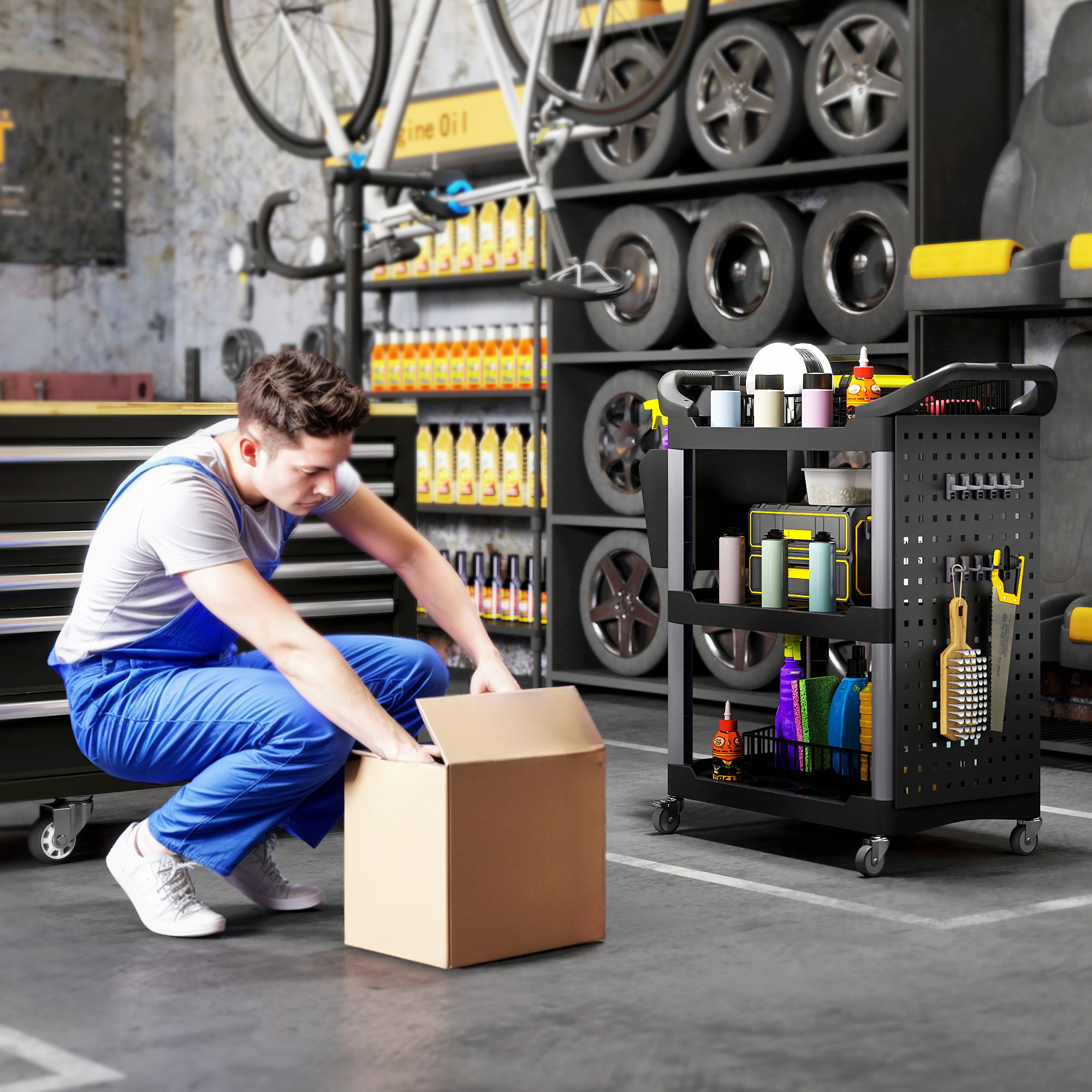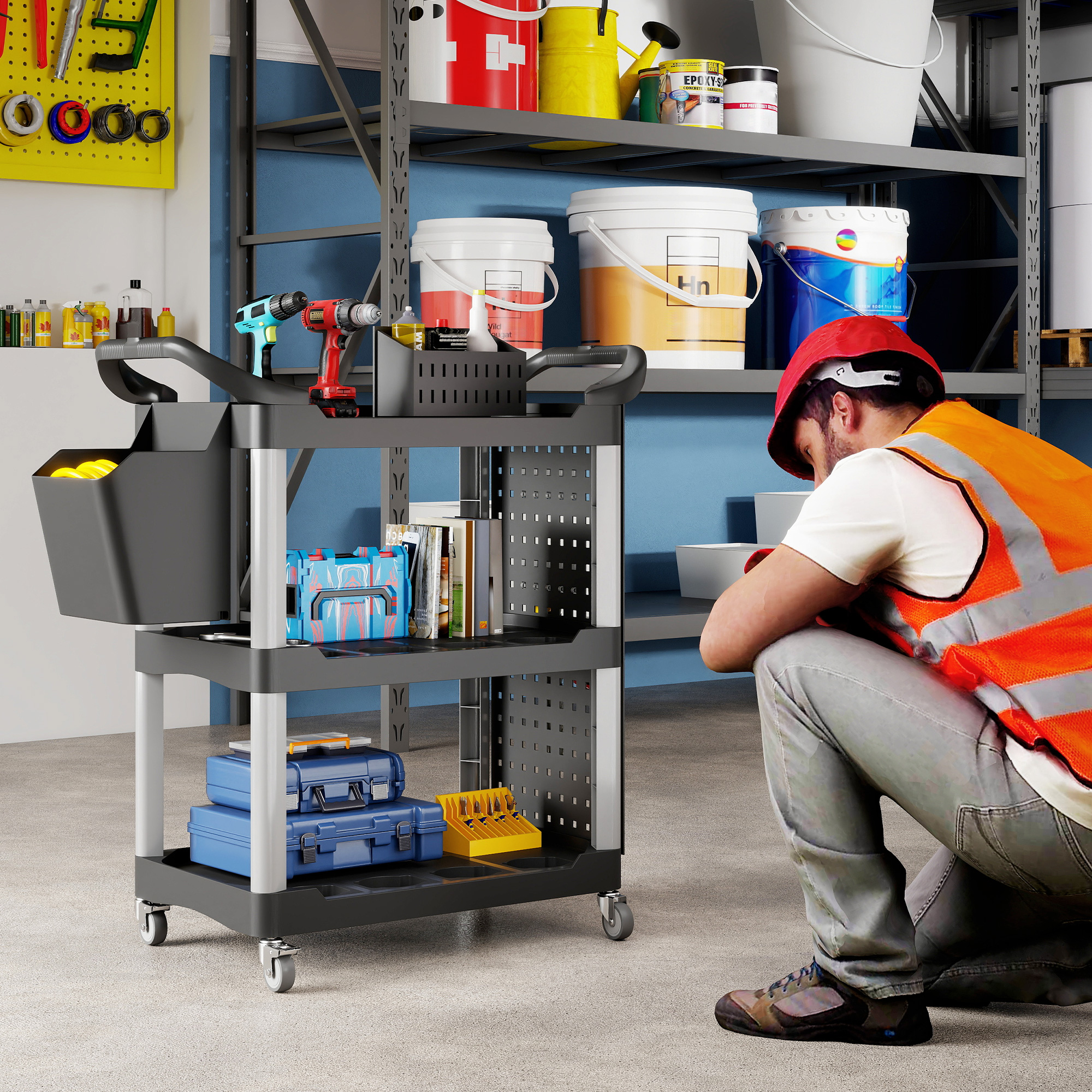 Unleash the power of organization with the [BRAND NAME] utility cart! This versatile tool cart is designed to keep your garage or workshop neat and tidy. It features three-tier shelves, a side-hole shelf with ten hooks for hanging tools, and a handy storage bucket. With side handles and wheels with brakes, this rolling cart can be positioned wherever you need it to optimize your workspace.