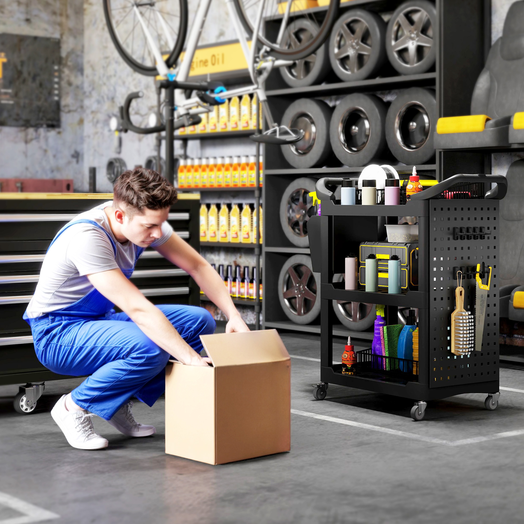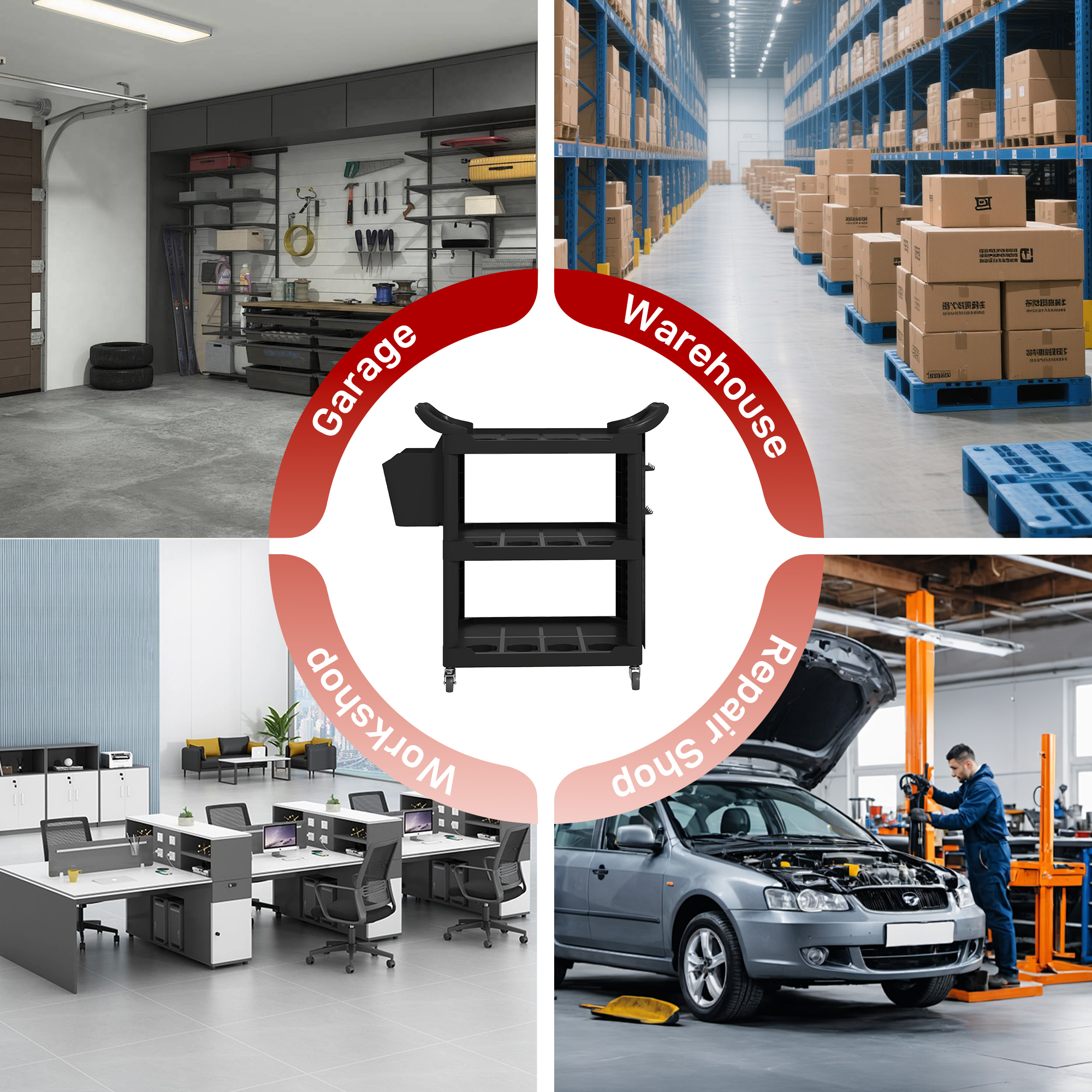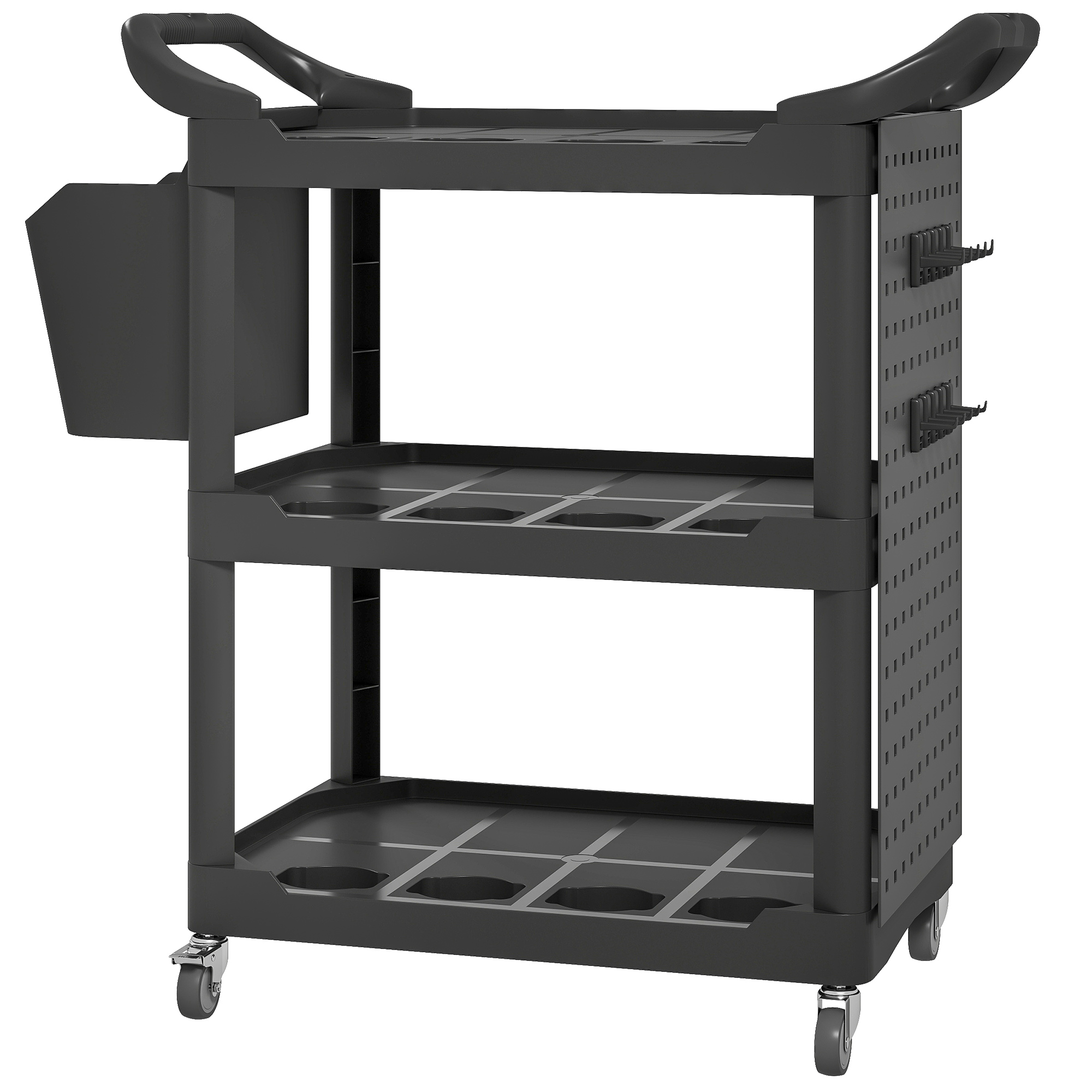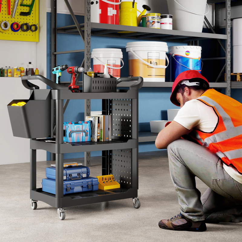 Unleash the power of organization with the [BRAND NAME] utility cart! This versatile tool cart is designed to keep your garage or workshop neat and tidy. It features three-tier shelves, a side-hole shelf with ten hooks for hanging tools, and a handy storage bucket. With side handles and wheels with brakes, this rolling cart can be positioned wherever you need it to optimize your workspace.
