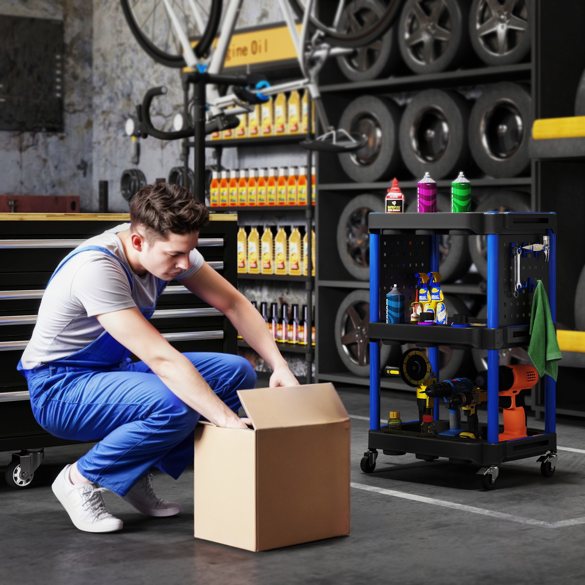 Transform your workspace with the [BRAND NAME] utility cart. Glide effortlessly with four universal wheels, two of which can be securely locked in place with brakes while working. Maximize your organization with three-tier shelves, side-hole shelves, and ten hooks. Suitable for garages, workshops, and warehouses, this rolling tool cart keeps tools tidy and accessible, making every project a smoother, more well-organized experience.