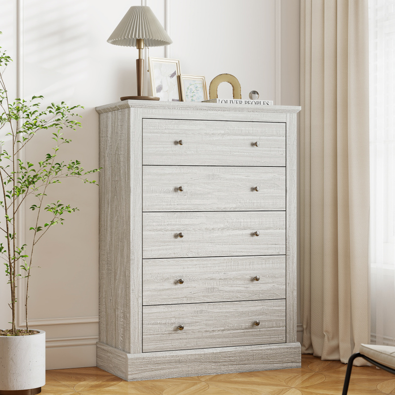 Transform your home into a cozy haven with the [BRAND NAME] clothes dresser. Tired of cluttered mornings? This dresser for the bedroom offers five spacious drawers, each capable of holding 20 shirts or 10 jeans, ensuring a tidy start to your day. Crafted from particleboard and MDF, it promises years of reliable use, blending farmhouse charm with practical storage solutions for your family.