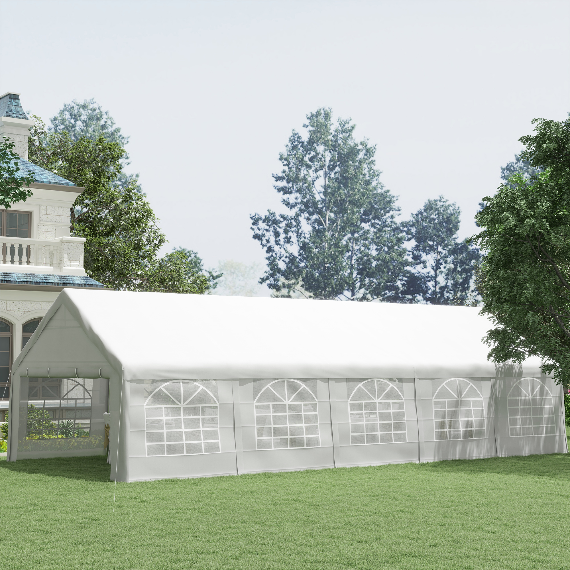 [BRAND NAME]'s 16' x 32' carport and party tent can protect your project car and transform any outdoor area into a unique event space. Excellent for wedding receptions, graduation parties, or extra-large barbeques, it offers ten stylish cathedral-esque windows. Excellent for small-to-medium cars, boats, furniture, and tools, it stops sun damage and sunburns alike. Made of a galvanized steel frame selected to withstand water and warping, [BRAND NAME]'s canopy tent provides portable protection.
