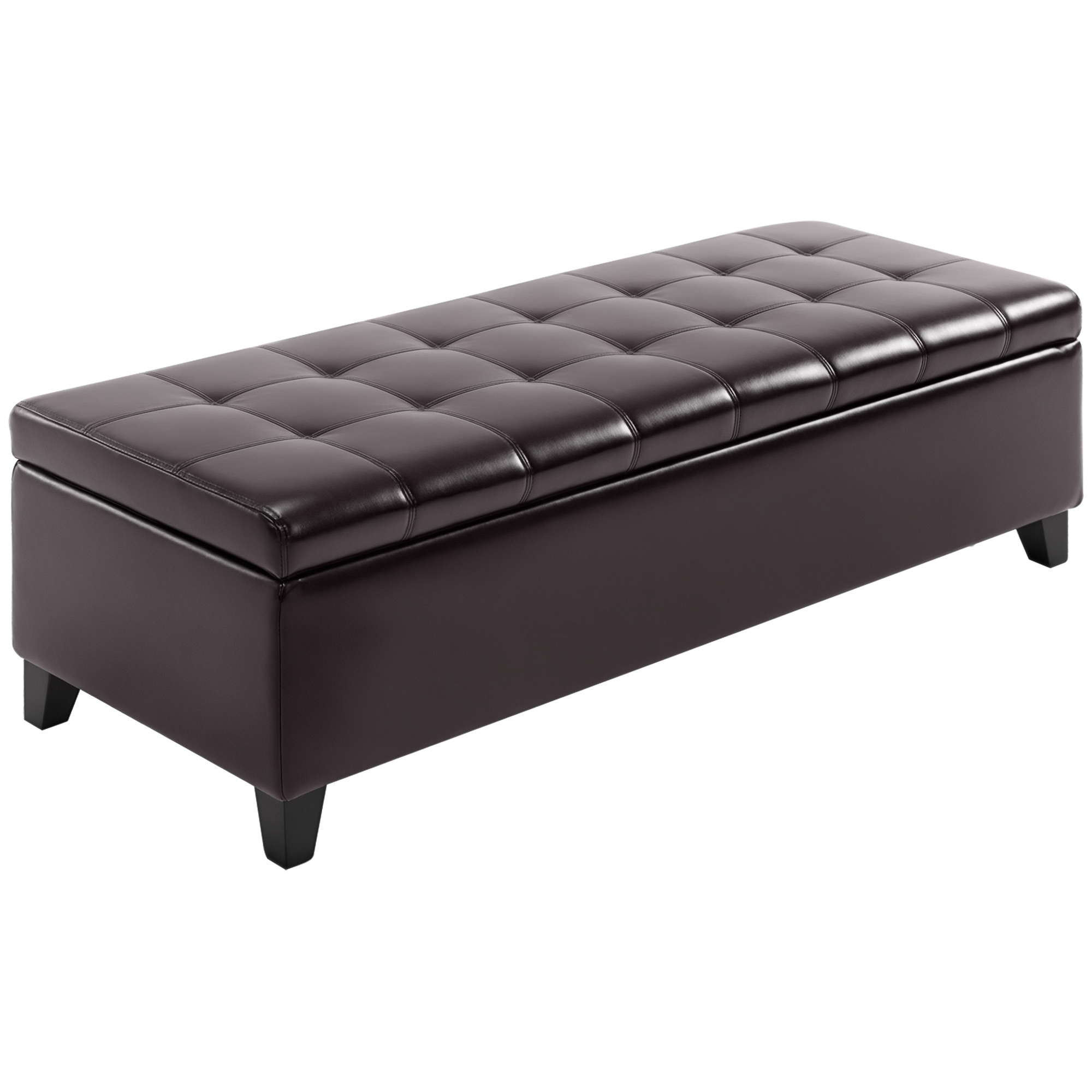 Finding the right style helps tie a room together and this chic, stylish [BRAND NAME] faux leather storage bench is a great fit for your living room, or entryway. It features an elegant tufted top, robust wooden legs and a roomy interior for pillows and blankets, shoes, or other accessories. The thick padded cushion offers comfortable extra seating and the hardwood feet support up to 265 lbs. Whether used for seating, or storage, this ottoman elevates any space.