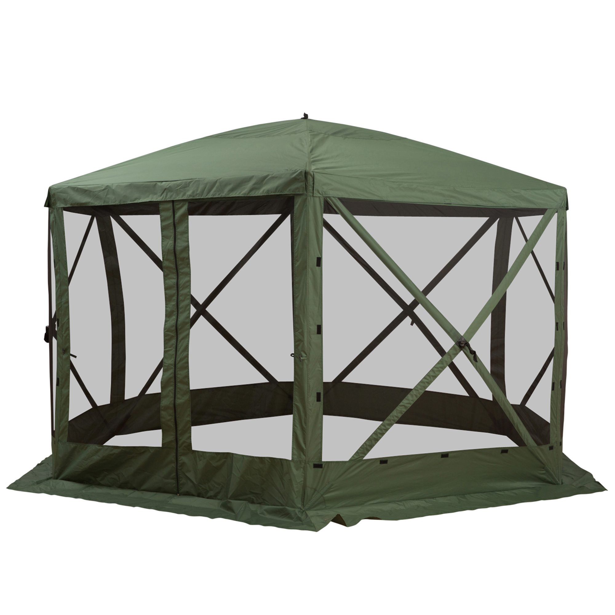 Accommodate yourself and others comfortably while camping at festivals, during picnics, and more with this hexagon screen tent from [BRAND NAME]. We made sure to include steel ground stakes and solid guy ropes to help stabilize the cabana and protect you against light wind and weather. Accommodating six to eight people comfortably, the screened canopy is finished with mesh sidewalls for increased ventilation and will make you fall in love with exploring the great outdoors.