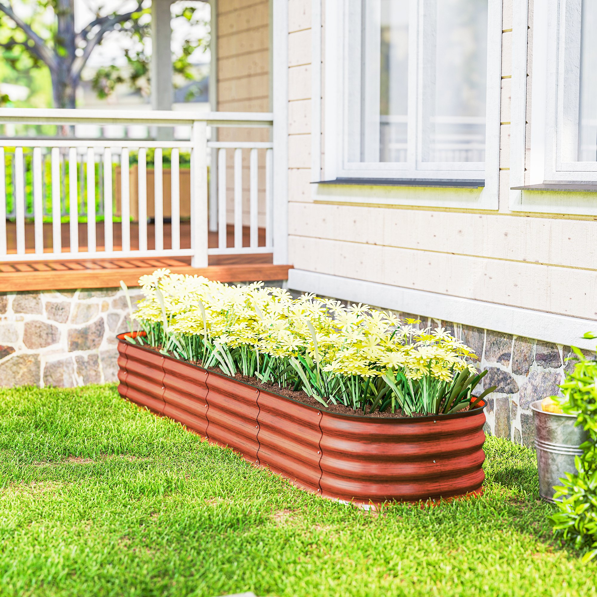 Whether you have a yard or only asphalt, an [BRAND NAME] raised planter box can help you get a garden going. It's a raised garden bed, allowing you a barrier between flowers and weeds with a special soil of your choice. It's a modular garden bed; as you get more, you have more options for sizes and shapes. It's an open-bottomed bed, allowing drainage and accommodating long-rooted plants. Made of weatherproofed metal, an [BRAND NAME] metal garden bed helps you raise your green thumb.