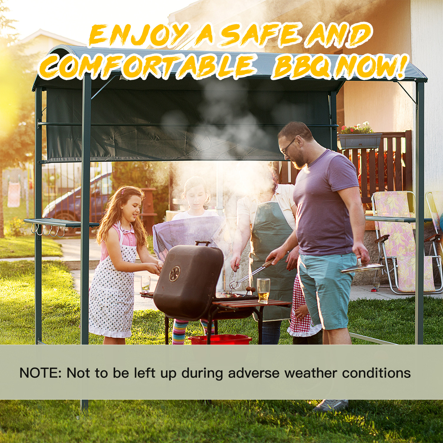 Tired of getting barbecued while barbecuing! This fabric top gazebo for grill will keep you cool. This stable BBQ canopy gazebo is designed with fire retardant cover lets you enjoy a safe and comfortable BBQ in any weather. With an extra side awning for sun protection. Comes equipped with table surfaces on two sides of the gazebo, allowing for the perfect party serving area. The classic and sturdy design provides you with years of beautiful, outdoor enjoyment.