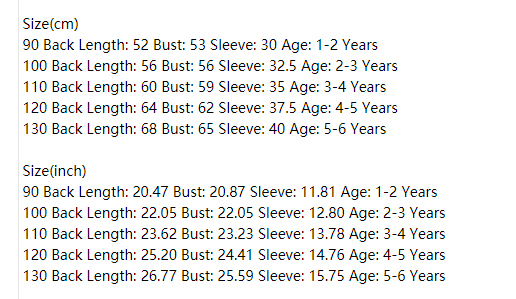 Sleeve length: long sleeve bust: 62 sleeve length: 37.5 age: 4-5 years old 130 back circumference: 68 bust: 65 years old