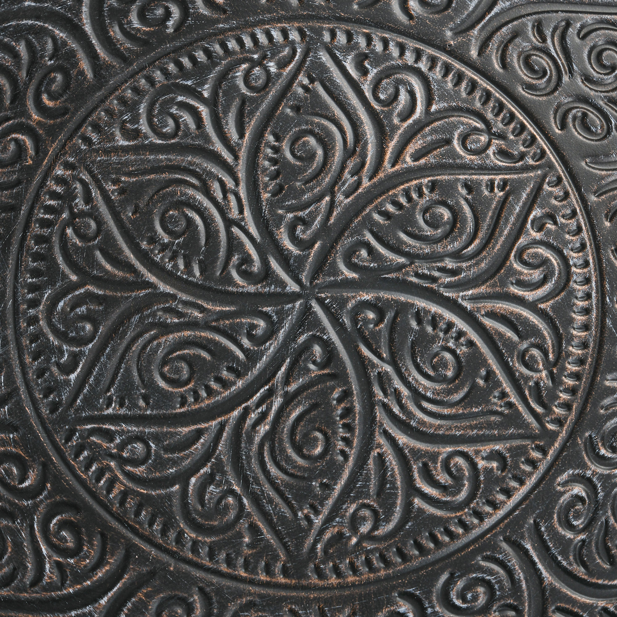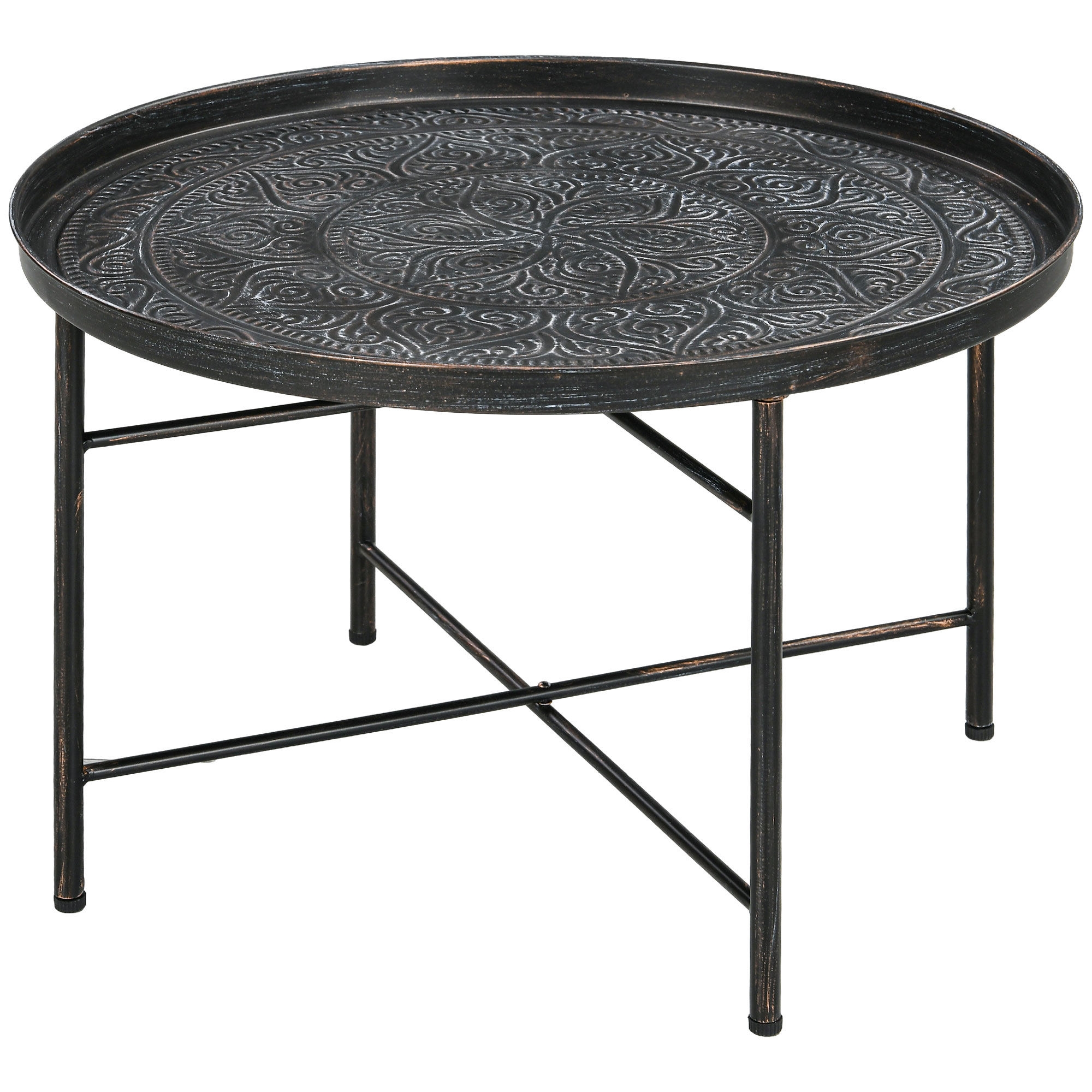 Enjoy the charm of [BRAND NAME]'s rustic coffee table. Its handmade brushed metallic finish and hammered floral pattern instantly elevate your living room. This round coffee table, doubling as a center table or a quaint tea table, features a painted metal frame with reinforced crossbars. Adjustable foot pads ensure that our end or side table stays stable on less-than-level locations. Make your house a home with [BRAND NAME].
