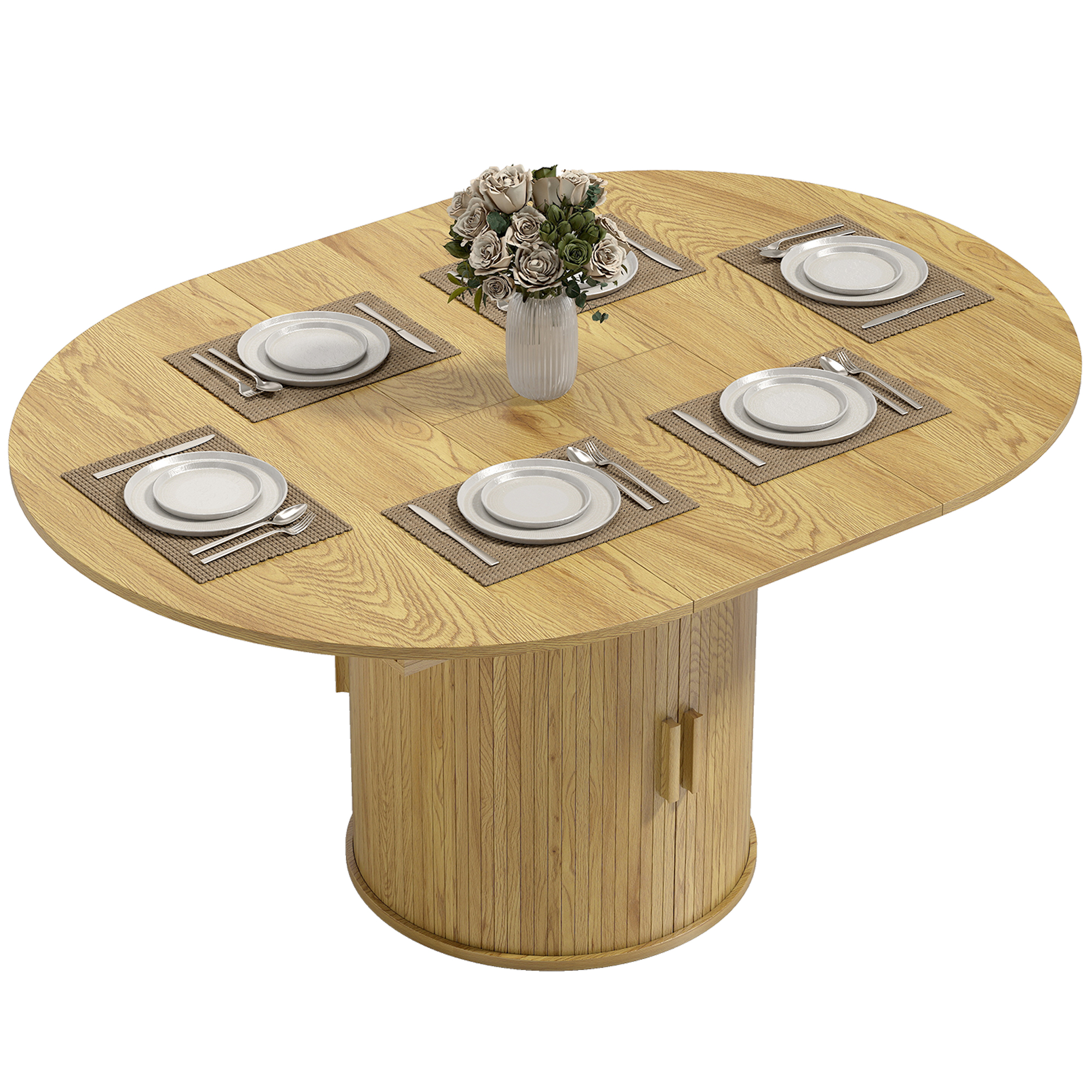 Transform your dining experience with this stylish [BRAND NAME] farmhouse dining table! Smooth sliding rails let you effortlessly switch from a cozy 4-person round table to a spacious 6-person oval, optimal for family meals or hosting friends. Smart hidden storage keeps dining essentials neatly tucked away in the under-table compartment and sliding-door pedestal. Combining practical functionality with timeless charm, this table adds elegance, convenience, and versatility to any home dining space.