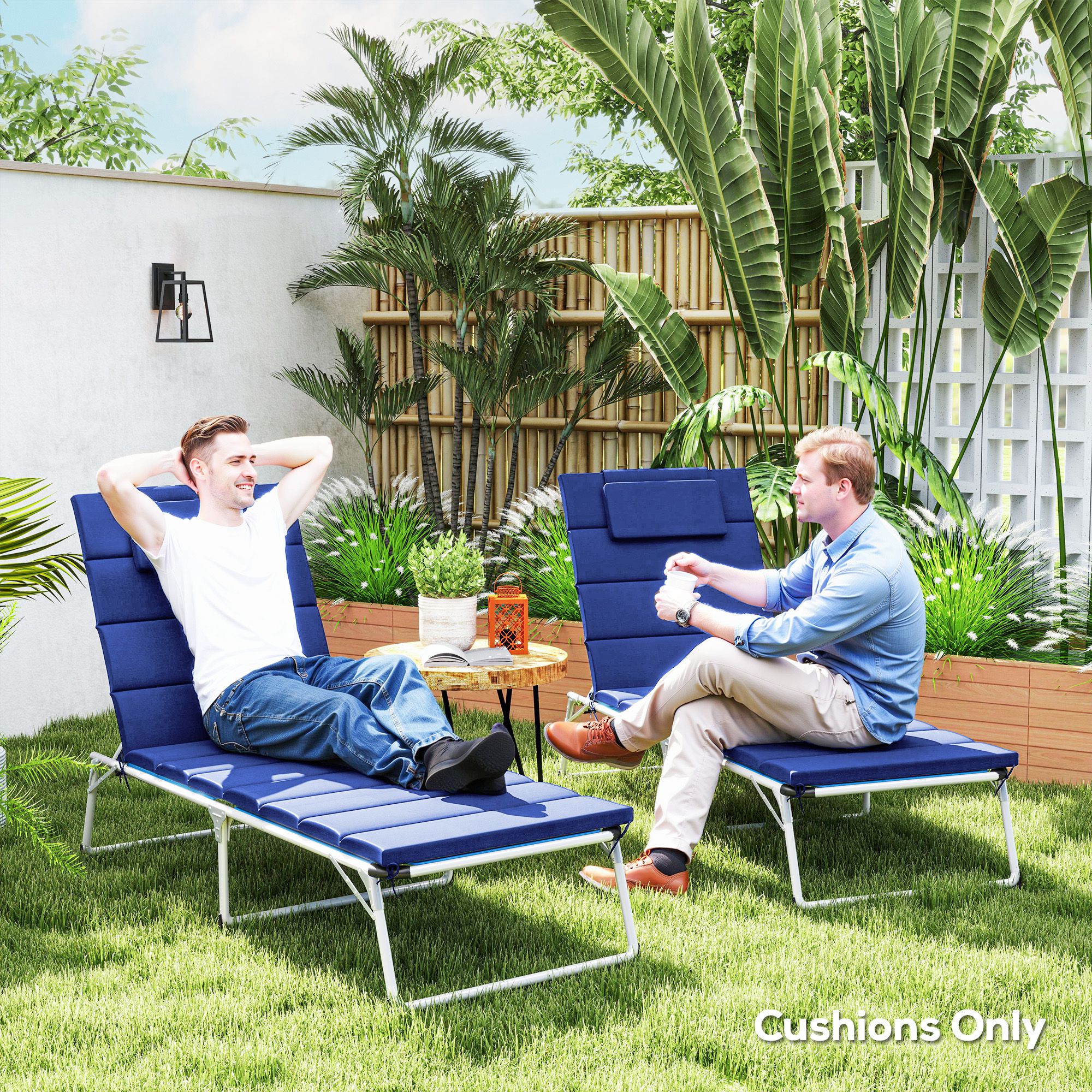 Transform your outdoor lounge chairs with these chaise lounge cushions with backs from [BRAND NAME]. Crafted from 230gsm Olefin with UPF50+ rating, the cushions resist fading and water splashes. The compartmentalized filling design is distinctive and gains esthetic beauty while allowing it to be folded and easily stored when not used. Enjoy the breathable fabric, full padding, and integrated headrest for hours in the sun!