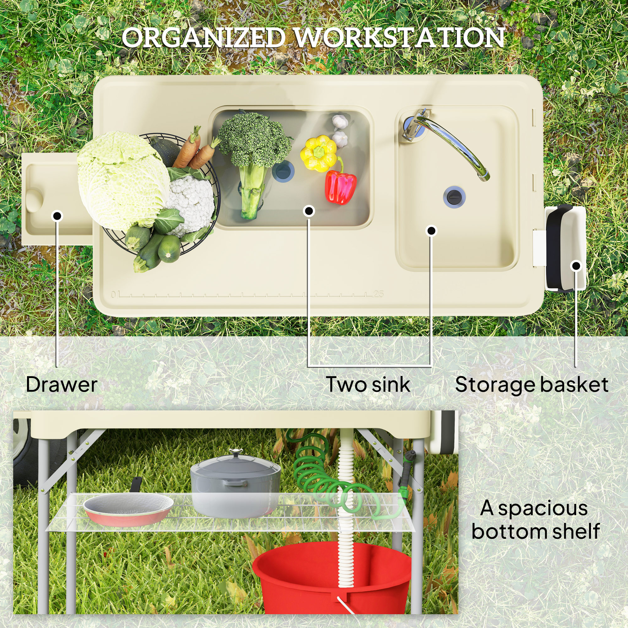 Folding Fish Cleaning Table with Sinks, Portable Camping Sink Table with Faucet, Drainage Hose, Sprayer, Shelf, Drawer and Storage Basket, Outdoor Fillet Table for Picnic Beach Patio, Tan