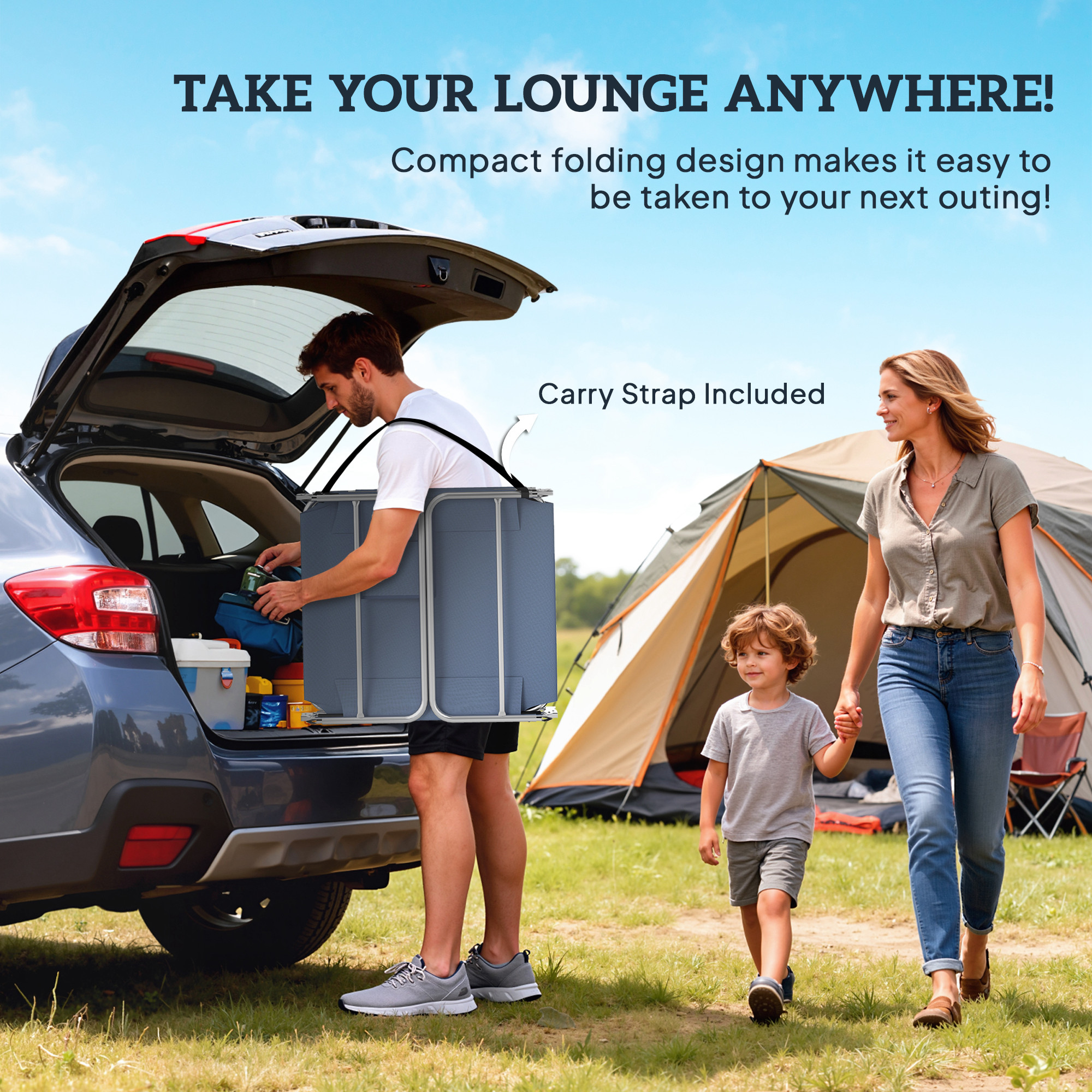 Do you wish you could bring the comfort of the resort on the road with you? You're a step closer. [BRAND NAME] has a folding chaise lounge so you can relax in the sun at the beach. Enjoy the outdoors; it features a 5-position reclining backrest, a reading hole for your head and arms, and a pillow. Place items in the pocket to keep them nearby. Made with tough Oxford fabric and water-safe powder-coated steel, it will follow you wherever the wilderness takes you. Get out, get comfy, get [BRAND NAME].