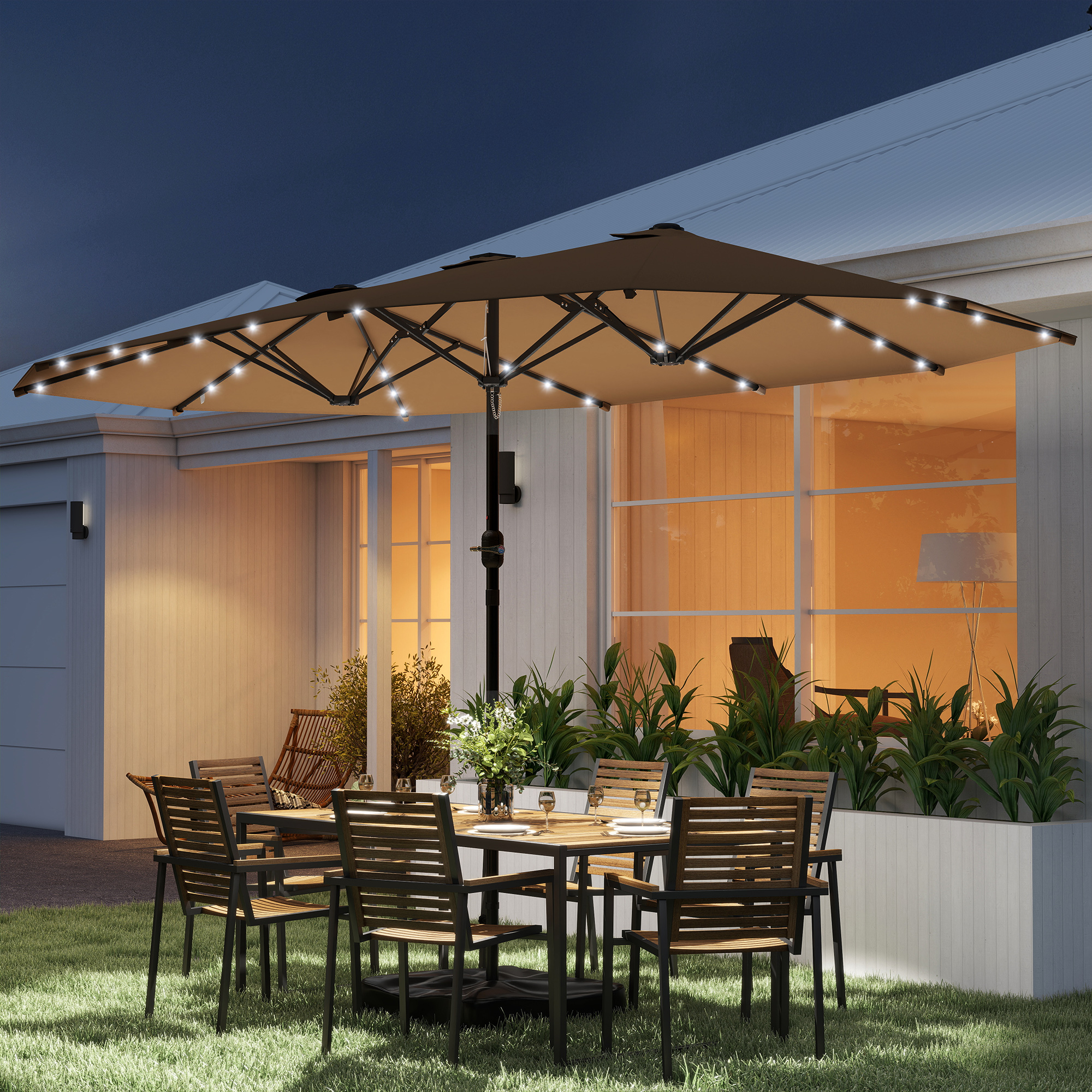 It's time for your garden to shine with this solar parasol from [BRAND NAME]. A stylish design, the sun parasol features 36 lights on the frame ribs to light up your outdoor seating when dark. The large double parasol garden creates plenty of shade, protecting you from direct sunlight. Using a crank mechanism for effortless opening and closing. If you've been searching for a new way to change your garden, then our outdoor umbrellas are the answer.