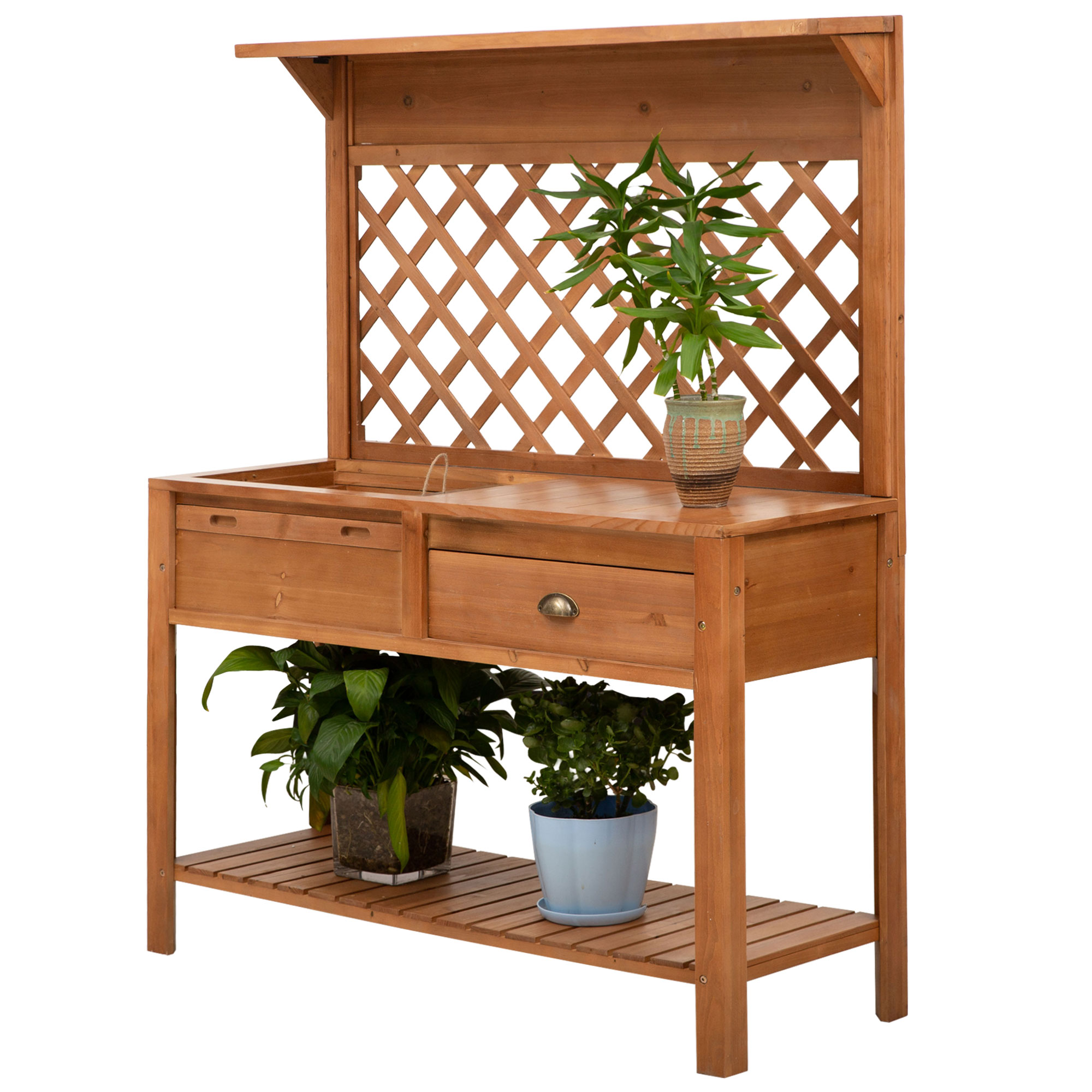 This outdoor potters bench from [BRAND NAME] has a simple appearance yet flexible functionality to bring an awesome addition to your garden or backyard. Made with solid wood, the planting table looks natural in any outdoor setting. The bottom of this sunk compartment features a drain to let extra water go. The shelf and drawer of this gardening table provide storage for pots, tools, and seeds. Check out this practical garden table for planting and add convenience to your life outside.