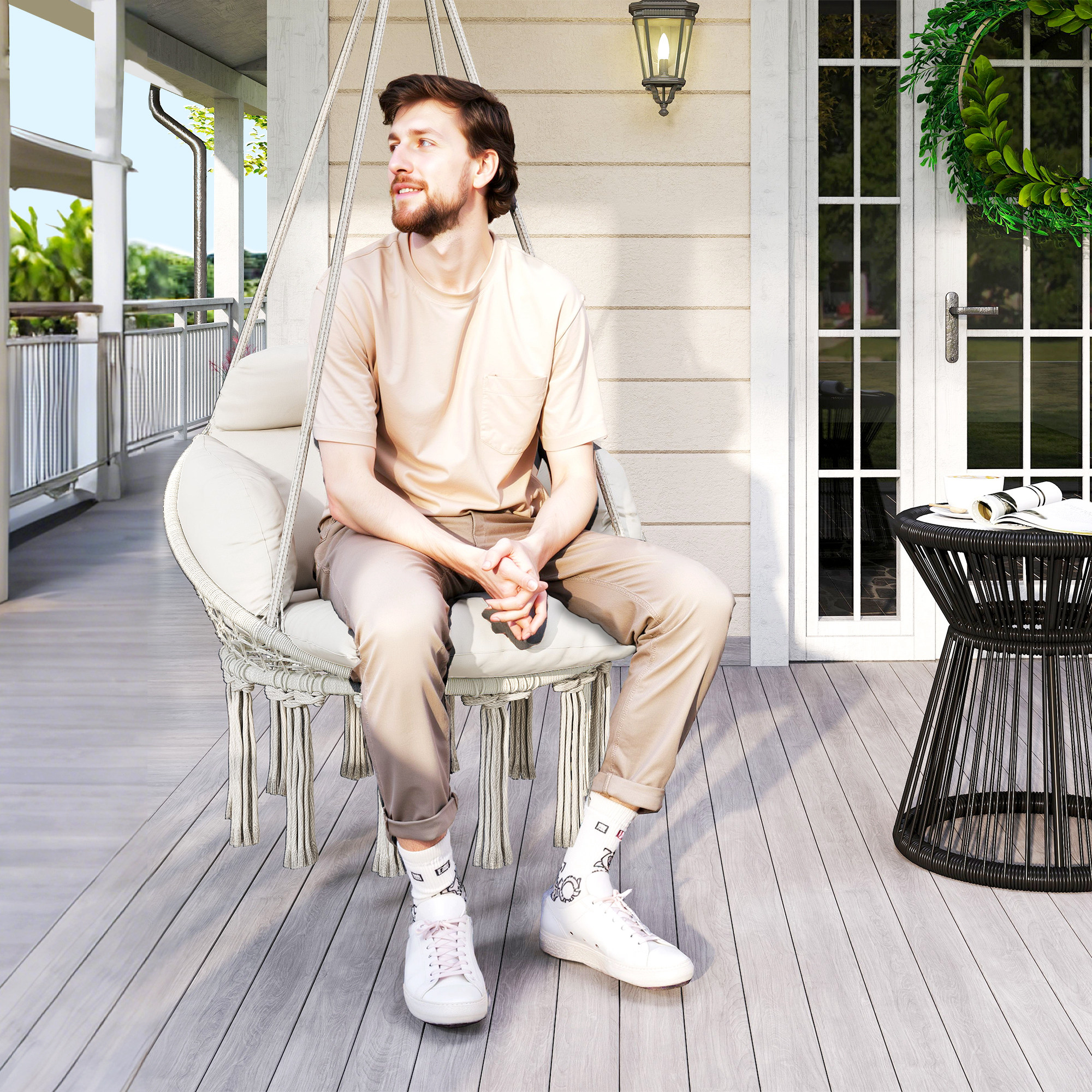 Hammock Swing Chair, Macrame Hanging Chair with Large Cushion, Chain, Steel Frame for Indoor Outdoor Use, Cream White