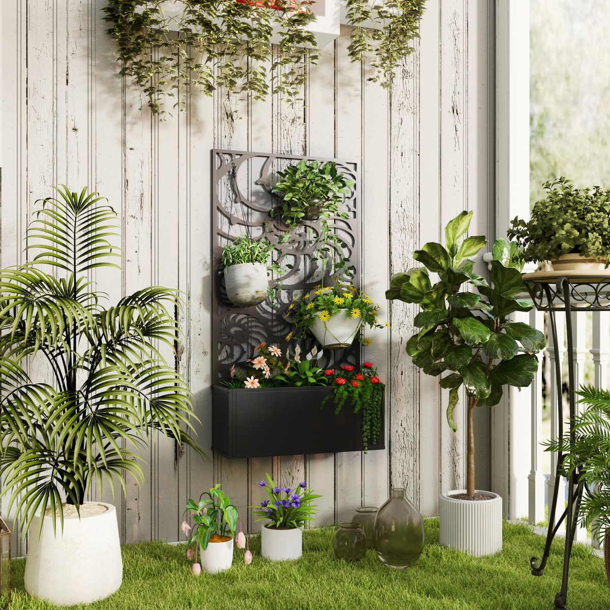 Transform your outdoor space with the [BRAND NAME] metal planter, featuring a privacy panel with snail cut-out motifs. This metal garden planter boasts a spacious 22.8" L x 9.1" W x 9.4" H interior, great for nurturing plants in up to 8 gallons of soil. Its versatile design allows for wall mounting or freestanding setups, making it a charming addition to any garden.
