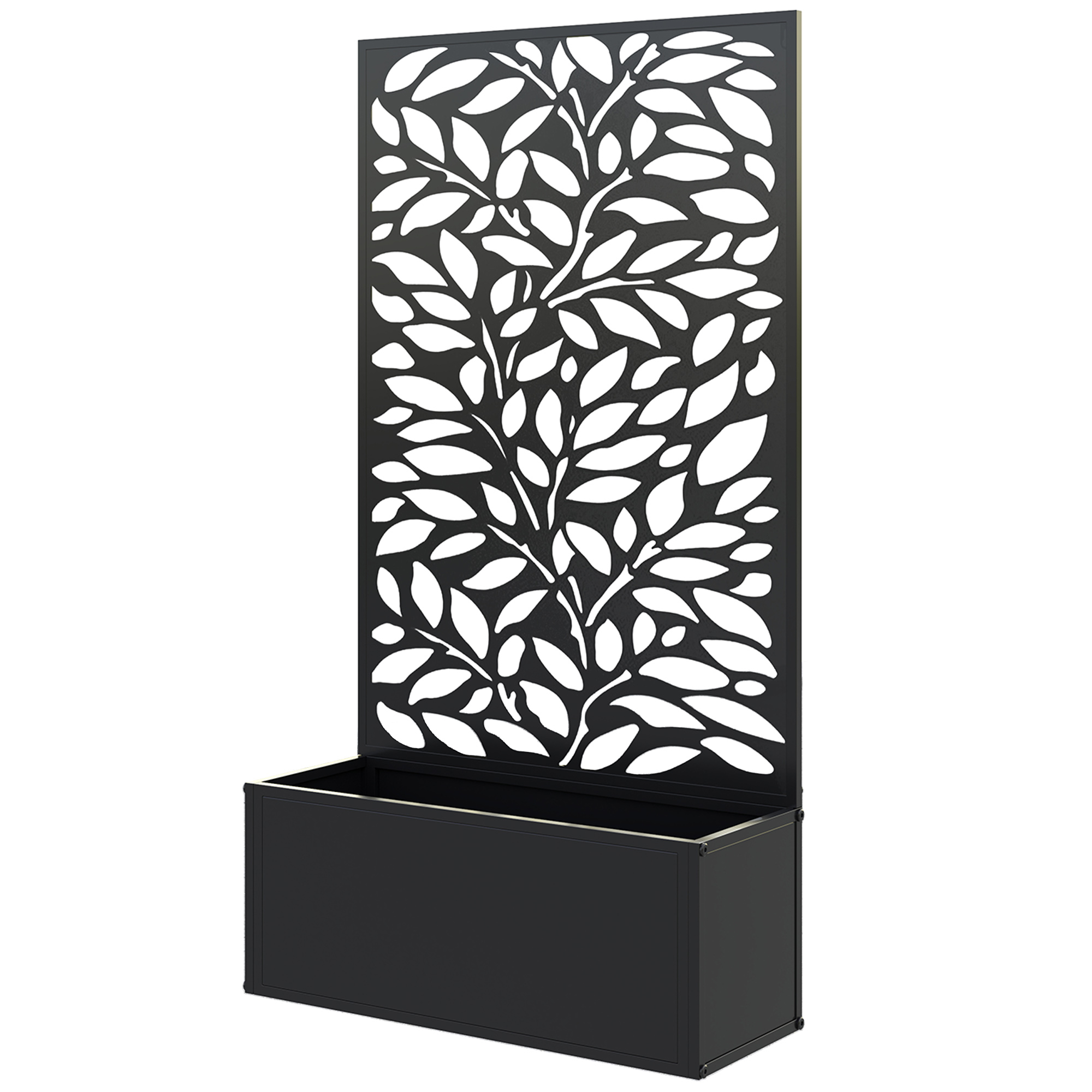 Transform your outdoor space with the [BRAND NAME] metal planter, featuring a privacy panel with leaves cut-out motifs. This metal garden planter boasts a spacious 22.8" L x 9.1" W x 9.4" H interior, great for nurturing plants in up to 8 gallons of soil. Its versatile design allows for wall mounting or freestanding setups, making it a charming addition to any garden.