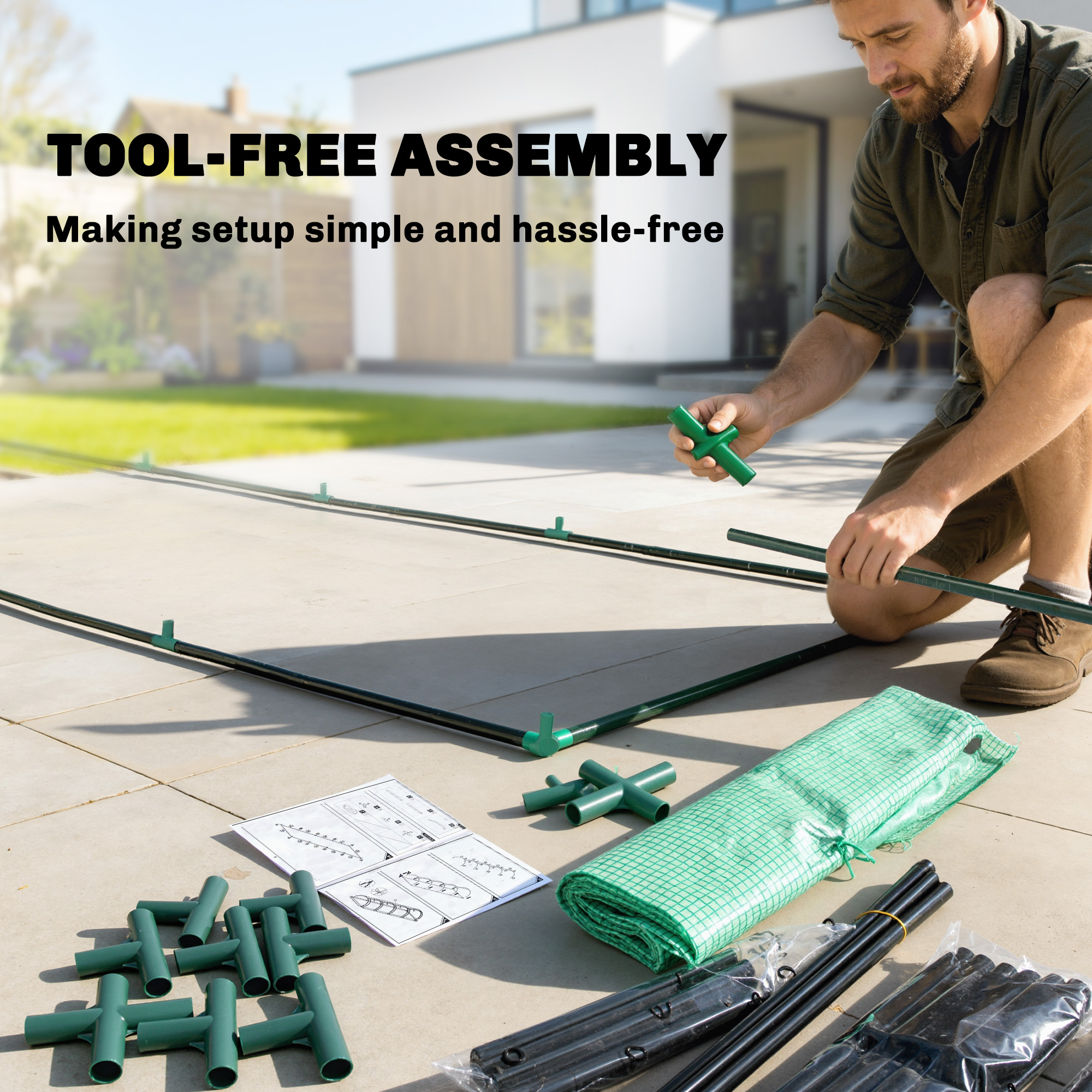 Tired of unpredictable weather and unwanted guests threatening your garden? The [BRAND NAME] mini greenhouse eases your worries. Four roll-up doors are great for easy plant care and excellent ventilation. The protective PE cover creates a nurturing microclimate. Tool-free assembly makes setup simple and hassle-free. The wide and low design is a great addition to balconies and patios. Great for every green thumb looking for a garden tunnel greenhouse to cultivate their garden polytunnel paradise!