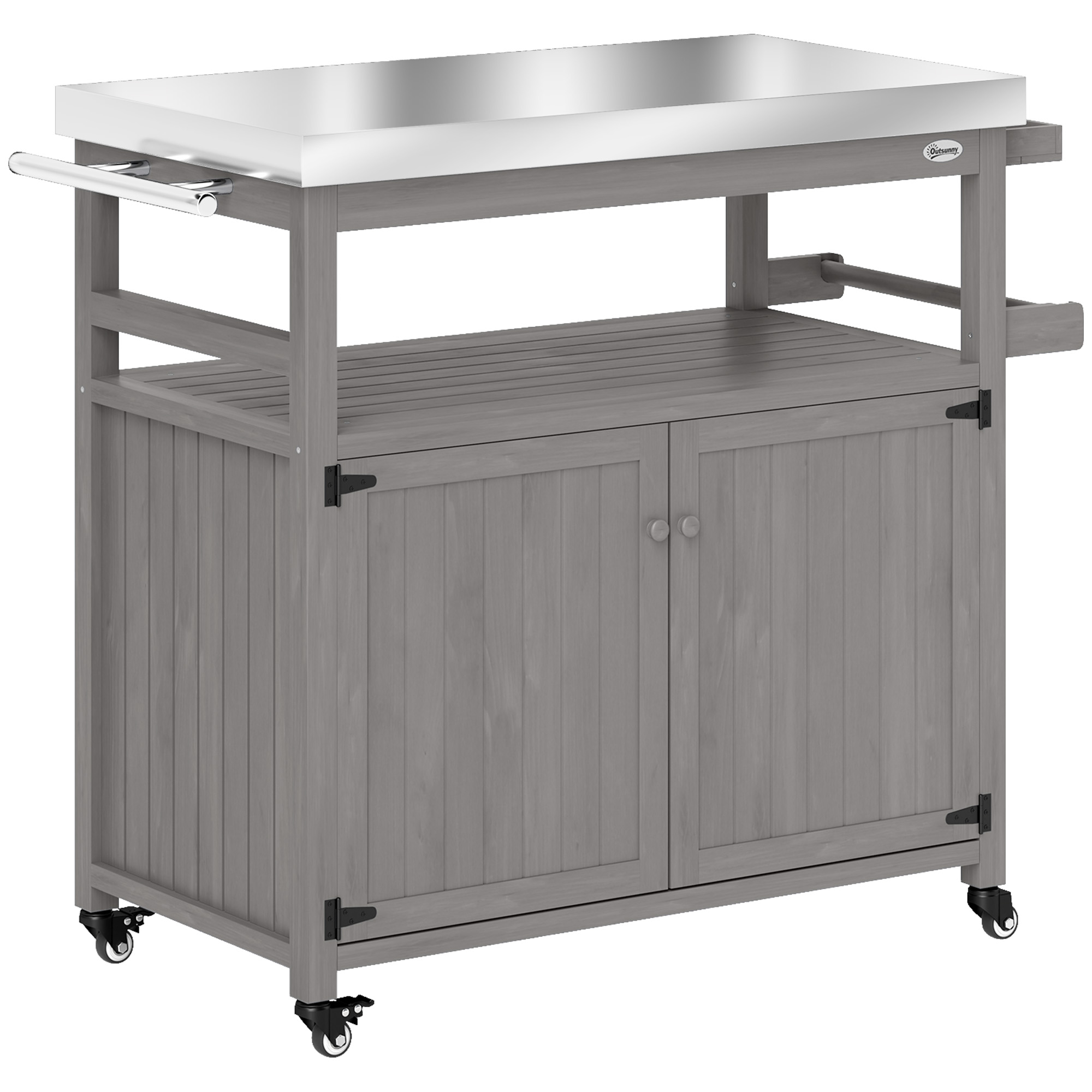 Outdoor Grill Cart w/ Stainless Steel Top, Solid Wood Outdoor Kitchen Island w/ Wheels, Storage Cabinets, Gray