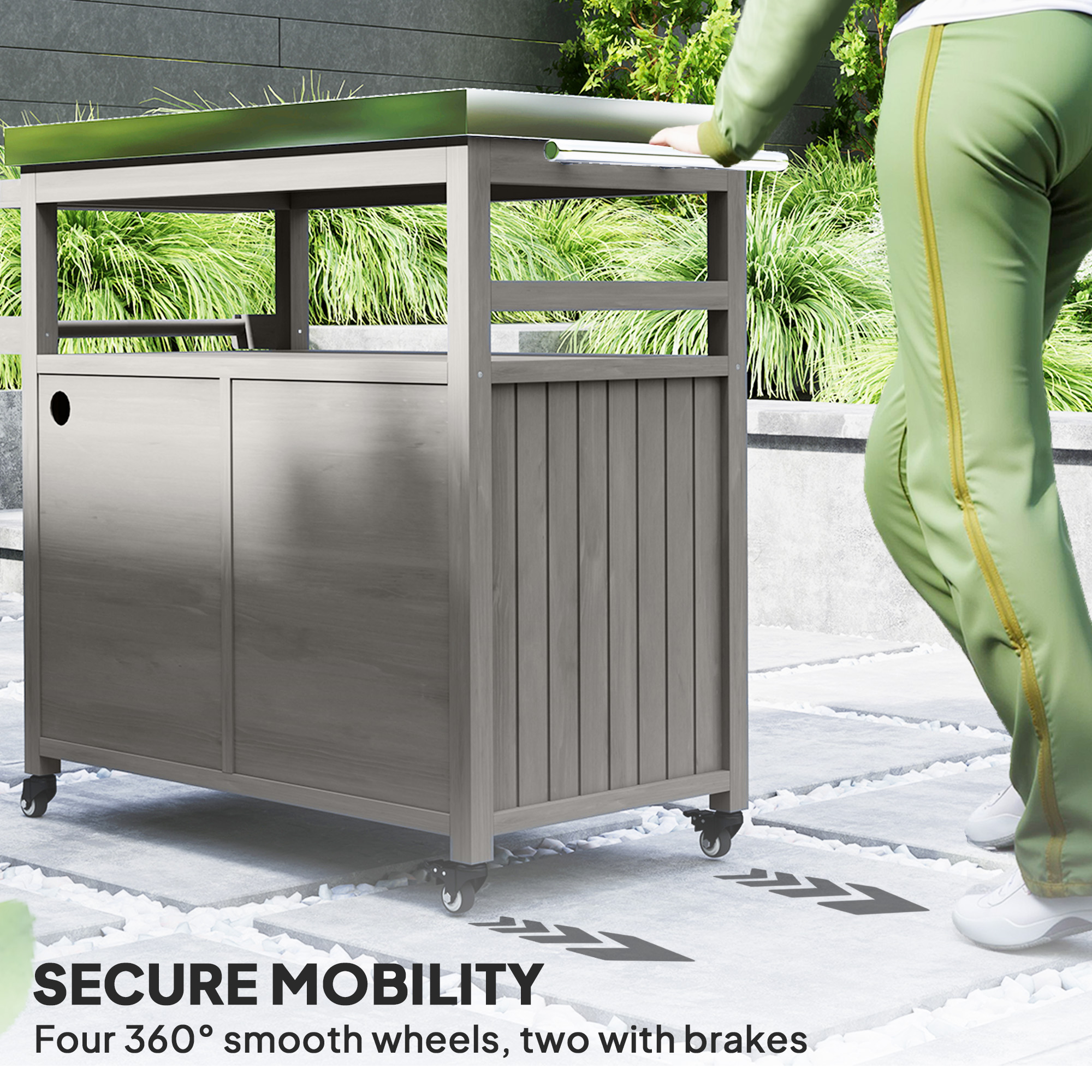 The [BRAND NAME] outdoor bar cart combines a heat-resistant stainless steel top with a solid wood frame for food prep and grilling. It features an open shelf, spice rack, towel holder, and two cabinets for storage, with an integrated exit hole on the back for safe gas line routing. Four 360° casters, two with locks, ensure easy mobility and stability. Great as a bar cart, prep station, or kitchen island, indoors or outdoors. Stylish and practical.