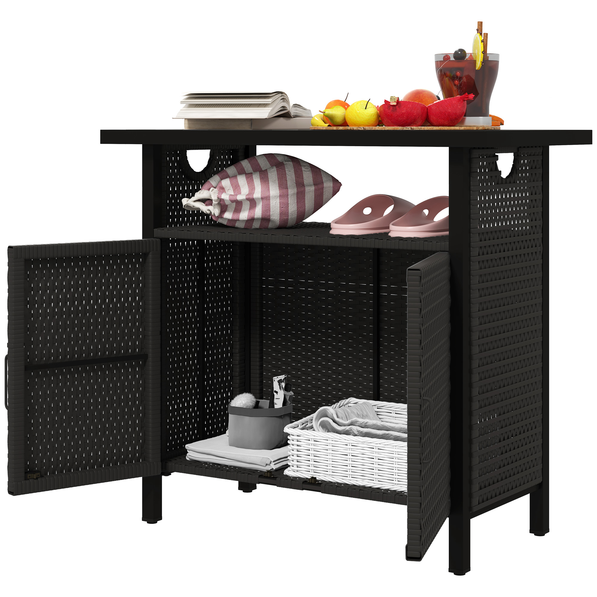 Transform poolside organizing with the [BRAND NAME] outdoor towel cabinet. Enjoy a spacious, ventilated design featuring a cabinet, open shelf, and surface suitable for stashing towels and pool essentials. Crafted with all-weather PE rattan and a powder-coated steel frame, this stylish pool valet promises to keep your outdoor area tidy and chic.