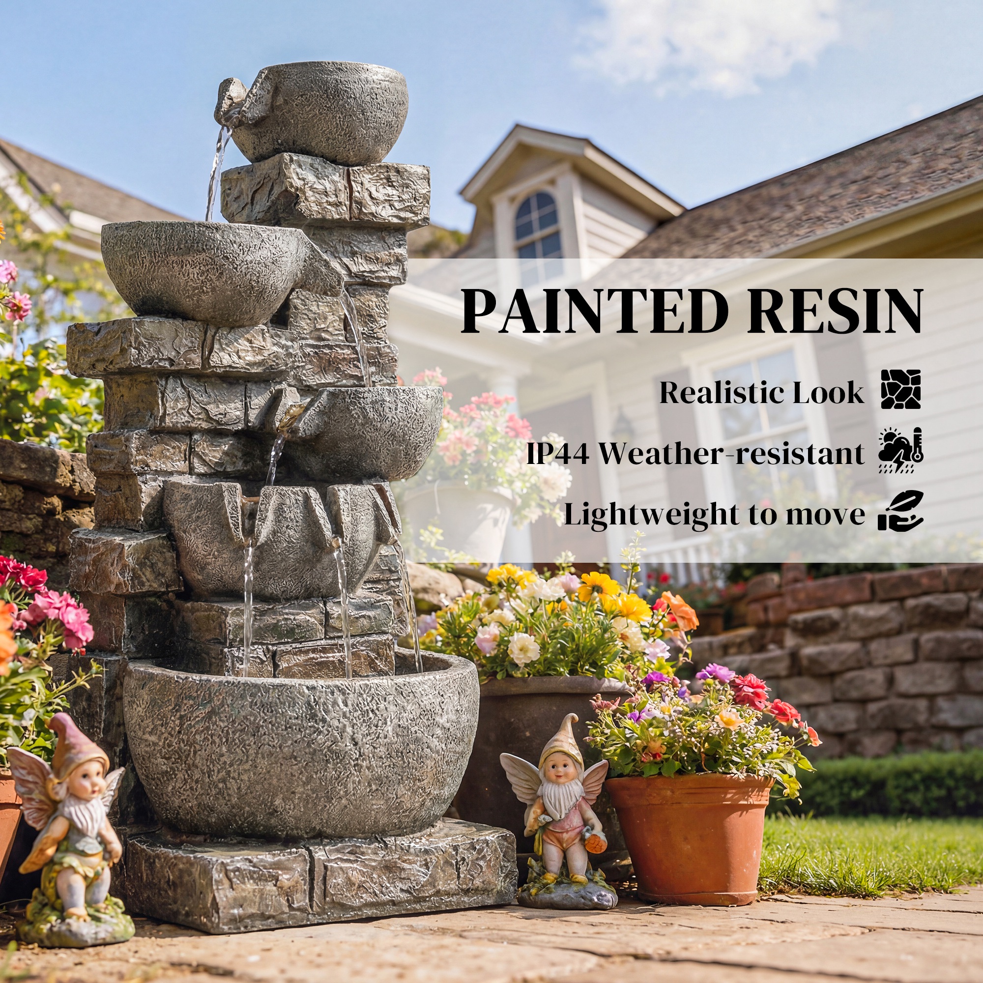 Escape the day's clamor in your own backyard. Unwind to the tranquil cascade of this [BRAND NAME] outdoor water fountain, its five tiers creating a sound that melts stress away. As evening descends, 24 warm LEDs illuminate the water, casting an enchanting glow. Meticulously crafted to resemble natural stacked rock, this elegant outdoor water fountain transforms your garden into a serene haven, enhancing your home's ambiance and your sense of peace.