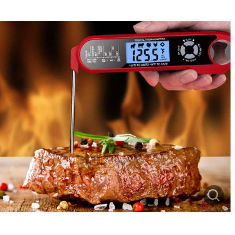 Features: Press ON/OFF (confirm key), C/F blue and white backlight, calibration function, life waterproof, strong magnetic, corkscrew function alarm function. Meat selection function, large battery. Large screen double probe thermometer