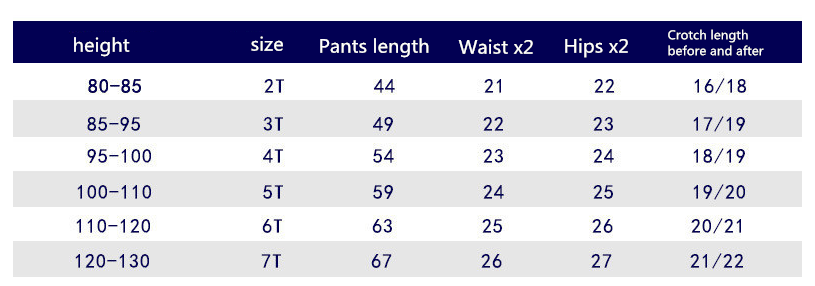 Size: The recommended height for tag 2T is 80-90, the recommended height for tag 3T is 90-95, the recommended height for tag 4T is 95-100, the recommended height for tag 5T is 100-110, the recommended height for tag 6T is 110-120, and the recommended height for tag 7T is 120-130