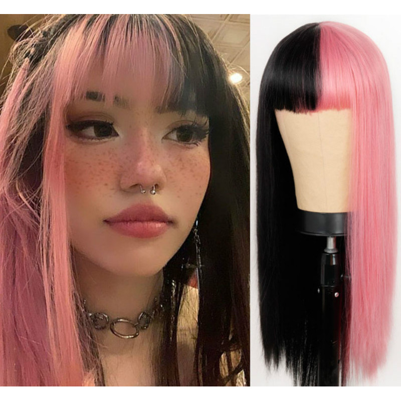 Wig Female European And American Fashion Long Straight Hair Yin Yang Gradient Black Powder Color Matching Long Hair Chemical Fiber Headdress Female