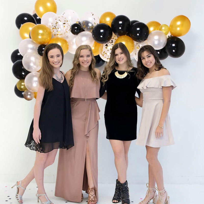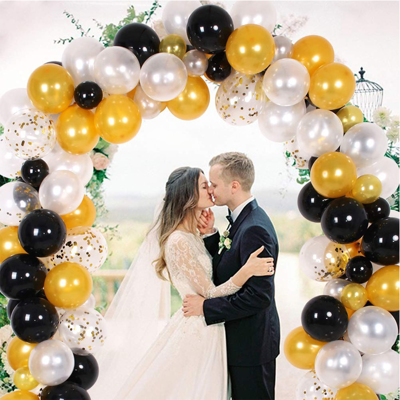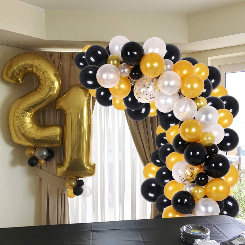 20 12-inch golden sequined balloons + 20 10-inch white latex balloons + 35 10-inch golden latex balloons + 35 10-inch black latex balloons + 10 5-inch golden latex balloons + 10 5-inch white latex balloons + 5 inches 10 black latex balloons + 1 glue dot + 1 hinge + 1 knotter