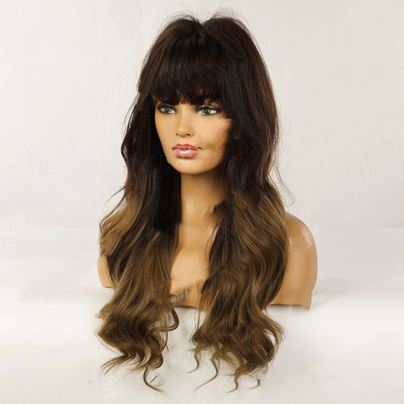 Wig hairstyle: long curly hair with oblique bangs
