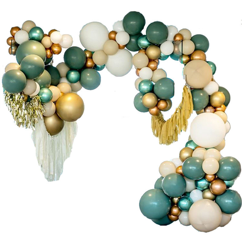 5-inch balloons: metal gold: 30, peach: 20, light gray: 15, maca green: 20, avocado green: 20